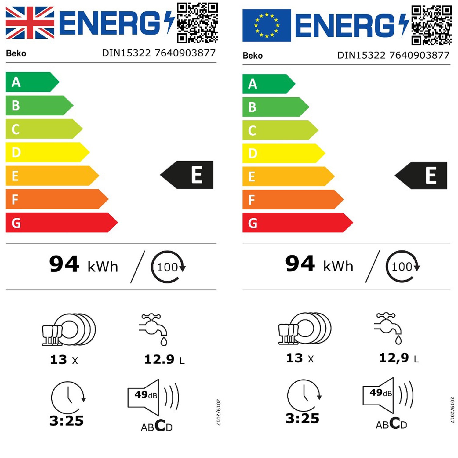 - E Energy rating to save you money off your energy bills (94 kWh/100 cycles)
