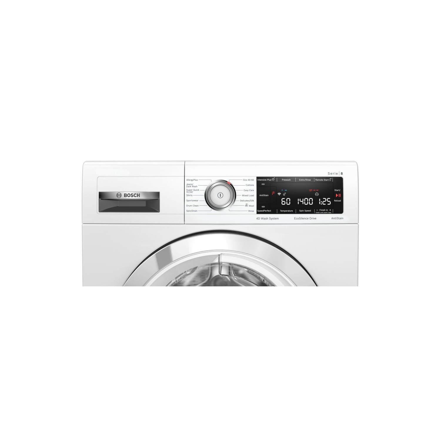 The Bosch Serie 8 WAV28MH4GB WiFi-enabled 9 kg 1400 Spin Washing Machine can be controlled remotely using the Home Connect app. Select programs, start and stop cycles and generally monitor the appliance from wherever you are.