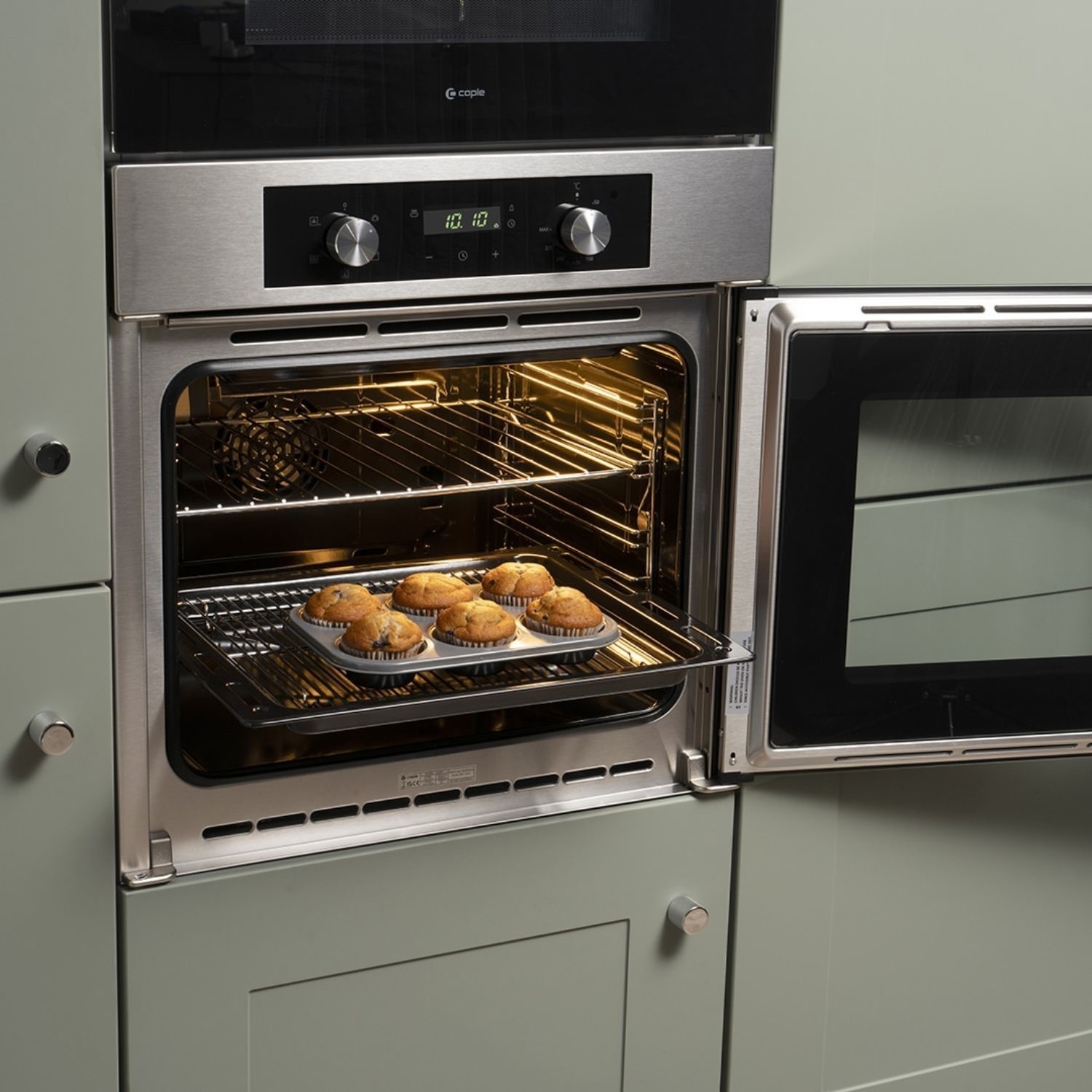 The Caple C2220 is a built-in 60 cm electric single oven with a side-opening door. It offers 67 litre capacity, 5 cooking functions, and MotionHeat+ technology for even heat distribution. With a stainless steel and black glass finish, touch controls, and reversible door, it combines functionality and style.