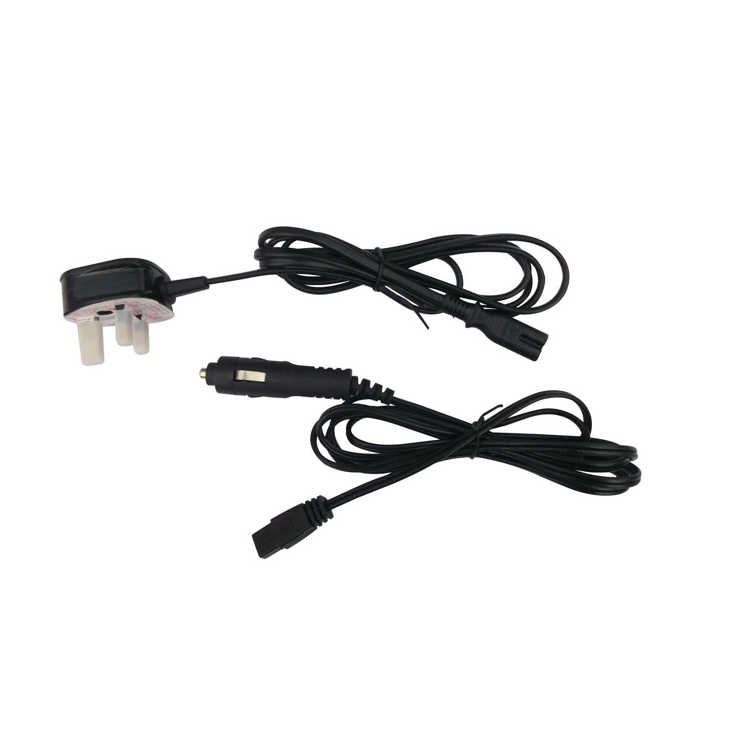 - UK mains plug and 12V car lighter adapter