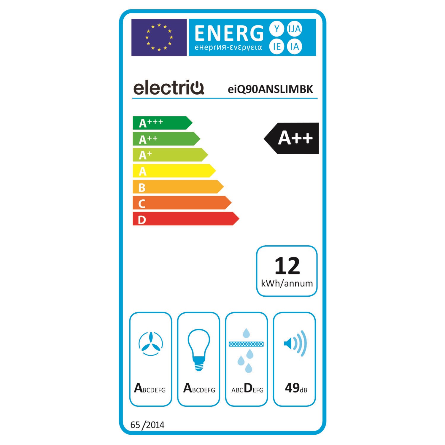 This electriQ Angled cooker hood makes a sleek addition to any kitchen. Its slim black, unbranded design not only ensures it fits seamlessly into your kitchen but effectively helps keep it clean and free of steam, grease, and strong cooking odours. With an A++ energy rating, it’s an economical choice for those looking to make some savings. It’s equipped with three fan speeds and operates at a maximum of 603m³/h which is enough to clear the air of unwanted smells in any large kitchen or open-plan space. It has a low noise level too; at just 49db you can leave the hood running and it won’t disrupt your evening meal or entertainment plans. It’s versatile and can be installed to extract or recirculate air depending on your kitchen’s layout. Plus, the chimney is height-adjustable to accommodate different ceiling heights.