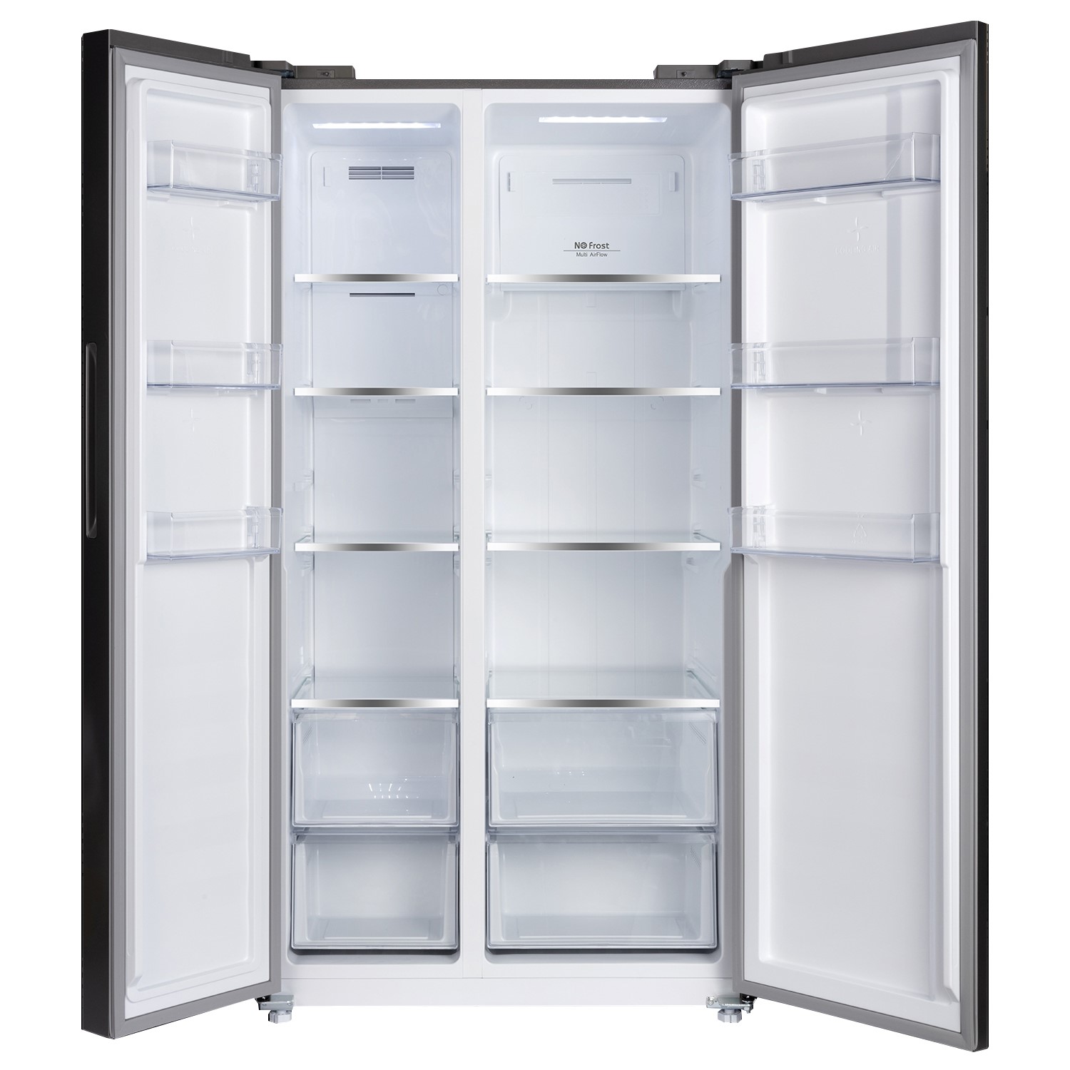 Feast your eyes on this stunning American-style side-by-side fridge freezer. Its premium brushed steel exterior enhances the look of your kitchen and provides ample space for all your weekly groceries. The double doors have recessed handles and an integrated control panel that makes setting adjustments a breeze, making it both stylish and practical. With multiple shelves and drawers, it's easy to access all your essentials, while keeping your fruit, veg and meat neatly organised. The inverter motor is super-efficient, helping you save on energy bills. Plus, the fridge uses multi-air-flow and total no-frost technologies, which keep your food fresh for longer, without any frost build-up.