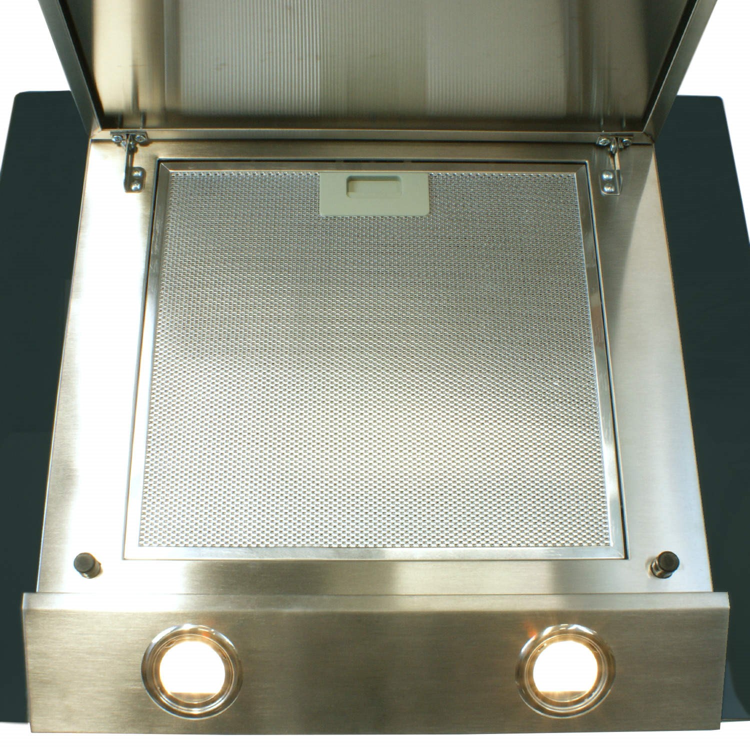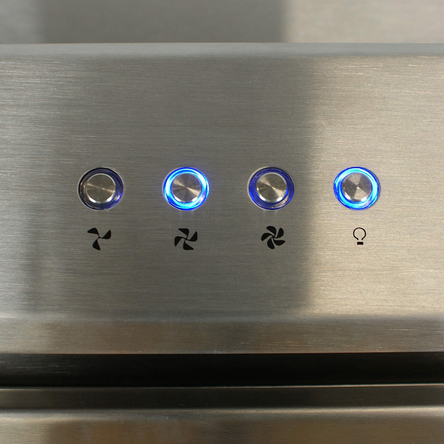 The simple push button controls provide quick and easy operation of the fan speed and lighting settings. The more steam and odour in the kitchen the higher fan speed you will need. The two LED lights are designed to illuminate your cooking space with pure white light. The benefits to this hood having LED lighting means they will last longer and also use less electricity than the traditional incandescent light bulbs.