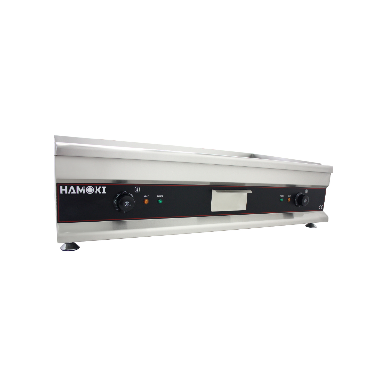 The Hamoki GR-1000 Griddle is a heavy duty, extra large, smooth surface, dual zone electric griddle, offering outstanding performance, durability, and versatility. Designed with busy chefs in mind, this powerful griddle is designed for heavy duty use and ensures consistent results every time, whether you’re preparing breakfast sausage bacon & eggs, sizzling burgers, or delicate pancakes. Its large flat cooking surface provides ample space to handle high volume orders, making it ideal for bustling restaurants, cafes, and catering businesses. With its sleek stainless steel construction, the GR-1000 is not only robust but also easy to clean, ensuring it withstands the rigors of daily use while maintaining a professional appearance. It has a thick 16mm heavy duty cooking plate with non stick coating, ensuring your food cooks evenly and releases effortlessly.