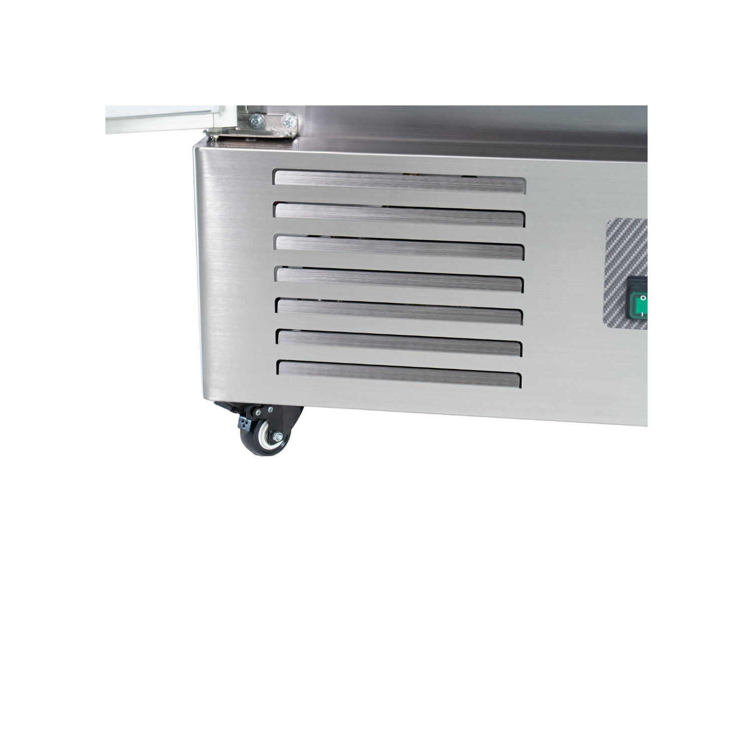 This prep counter is engineered for technical reliability and ease of use. It comes fitted with a standard 13A plug, enabling immediate setup without specialized electrical work. The unit features a fully adjustable digital temperature controller and fan-assisted cooling to ensure consistent airflow and food safety across its two interior shelves. With a 900mm width and GN-compatible interior, it fits seamlessly into professional kitchen layouts while providing the necessary volume for essential ingredients.