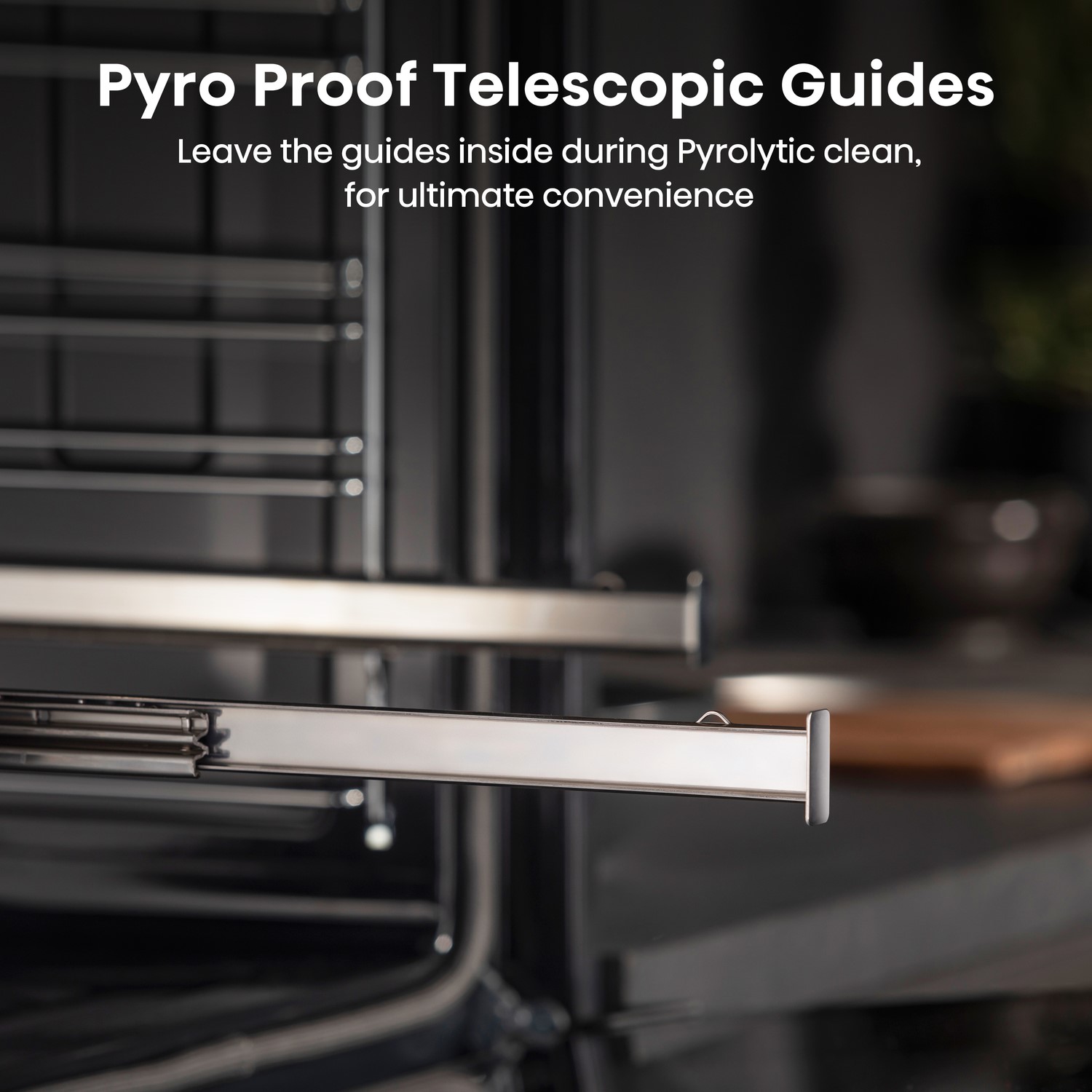 - Pyro Proof Telescopic Guides - fully extending guides that can be left inside during Pyrolytic cleaning for convenience