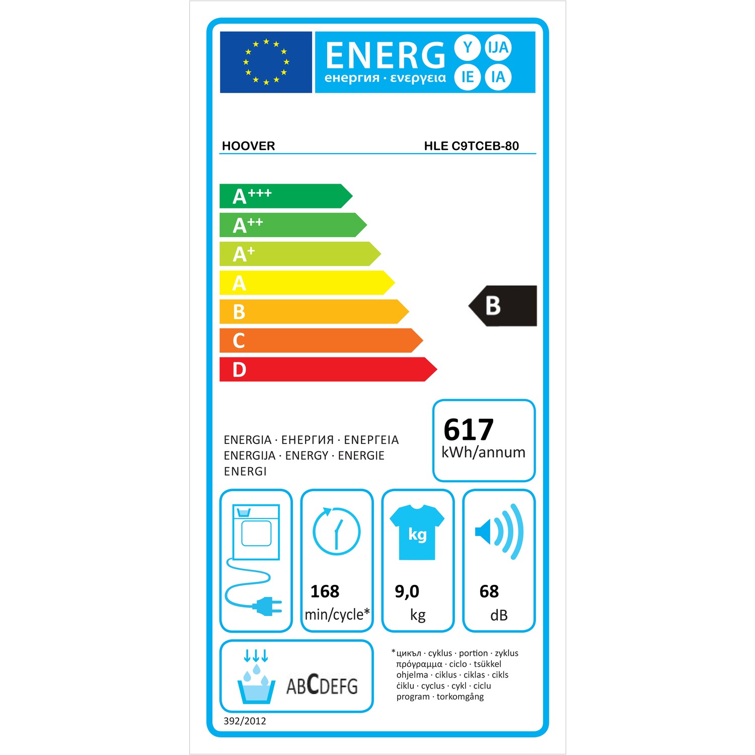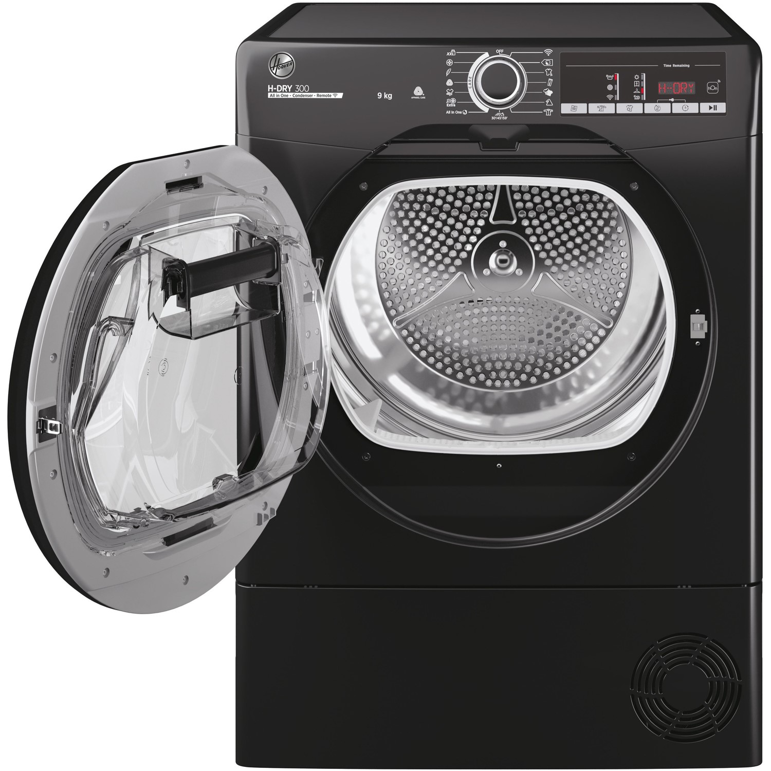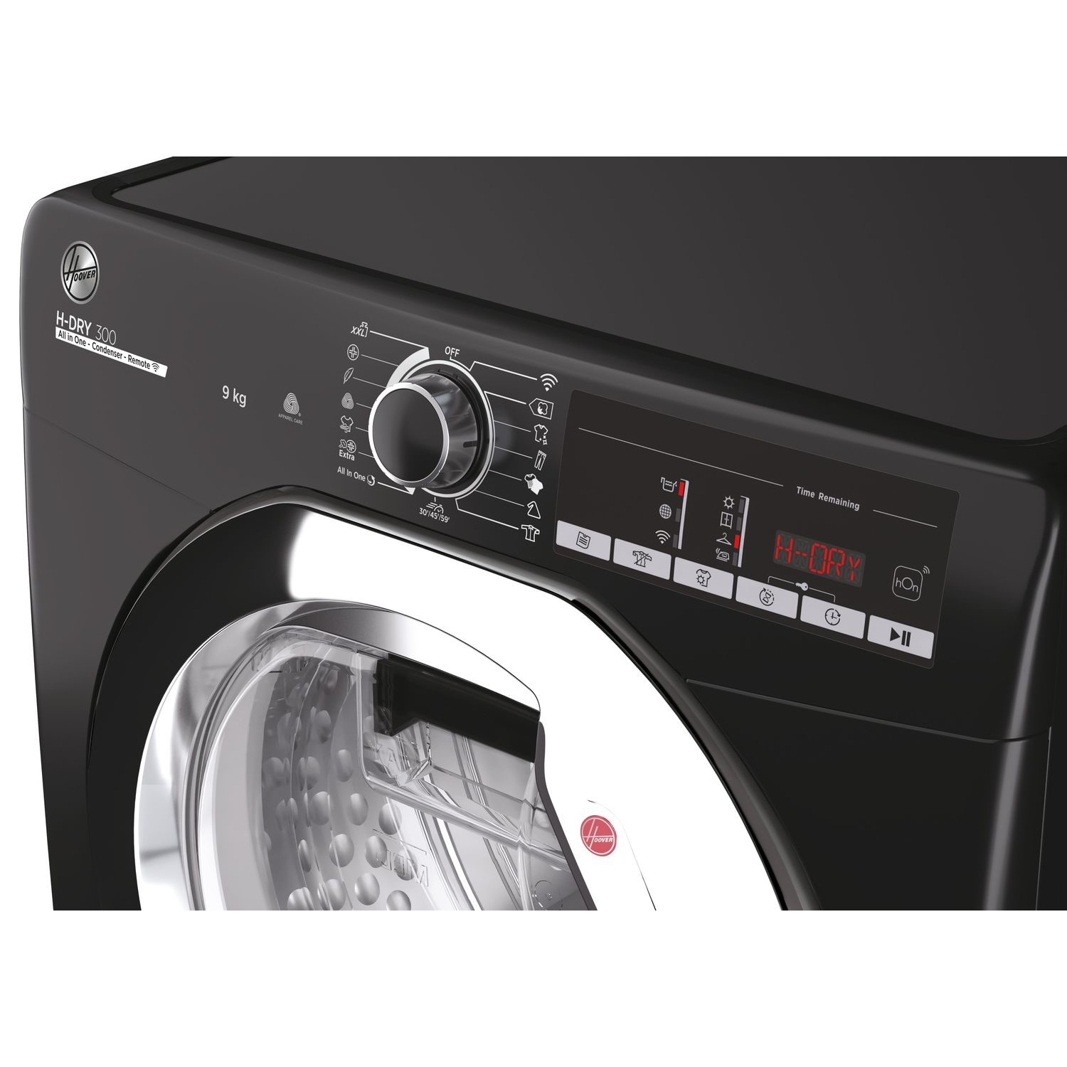 This Hoover HLE C9TCEB Condenser Tumble Dryer comes with a 9kg load capacity to give you fast and effective drying and an B energy rating. There are 14 drying programmes to choose from, including rapid drying options. The clever Sensor Dry function allows you to choose the level of dryness you require from four options, and the machine will automatically switch off when it senses that this level has been reached, saving you time and energy. You can also use the Timed Drying function, which will let you set the cycle for a specific amount of time. With Wi-Fi Technology it allows you to connect to the machine to Candy's new hOn App, using a smartphone or tablet so you can choose additional programs and monitor cycles and run diagnostic checks.