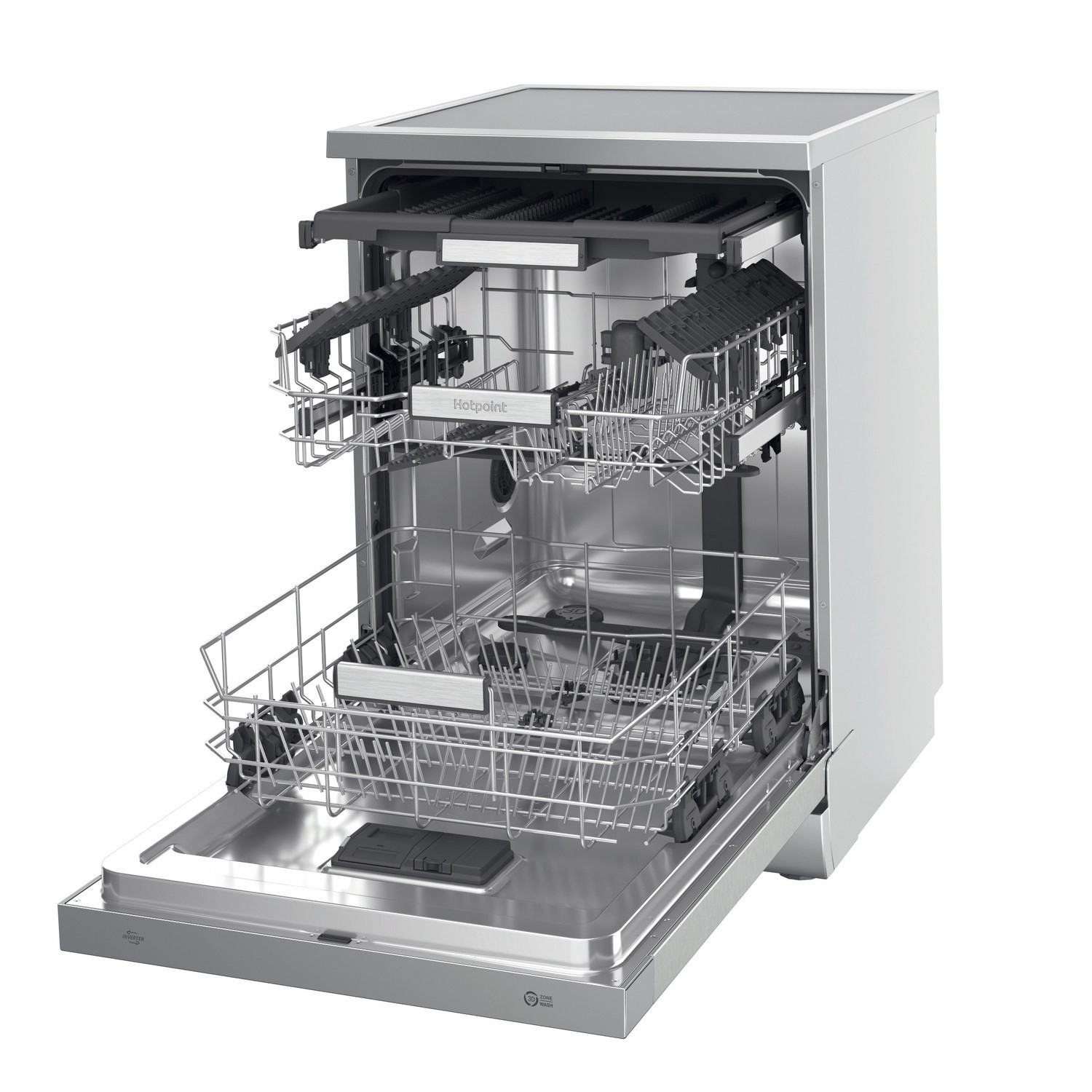 The new Hotpoint 15 place setting freestanding H7F HS51 X UK dishwasher means you can skip the scrubbing and get a sparkling clean you can count on. The dishwasher includes Maxi Space tub, which means you get 10%* more usable space, so if you're cooking a big Sunday roast, or batch cooking for the week ahead, Hotpoint has you covered. Rely on 3D Zone Wash when you've got tough baked on food, like lasagne. This technology gives you 80%** more power, giving you a sparkling clean. The dishwasher also includes ActiveDry to give you better drying results it opens the door near the end of the cycle to allow air to circulate for a natural dry. Help to keep your energy and water use in check with Auto Programmes that can save you up to 50%*** on resources. They programmes automatically adjust the energy, water and time based on the level on dirt on your dishes.