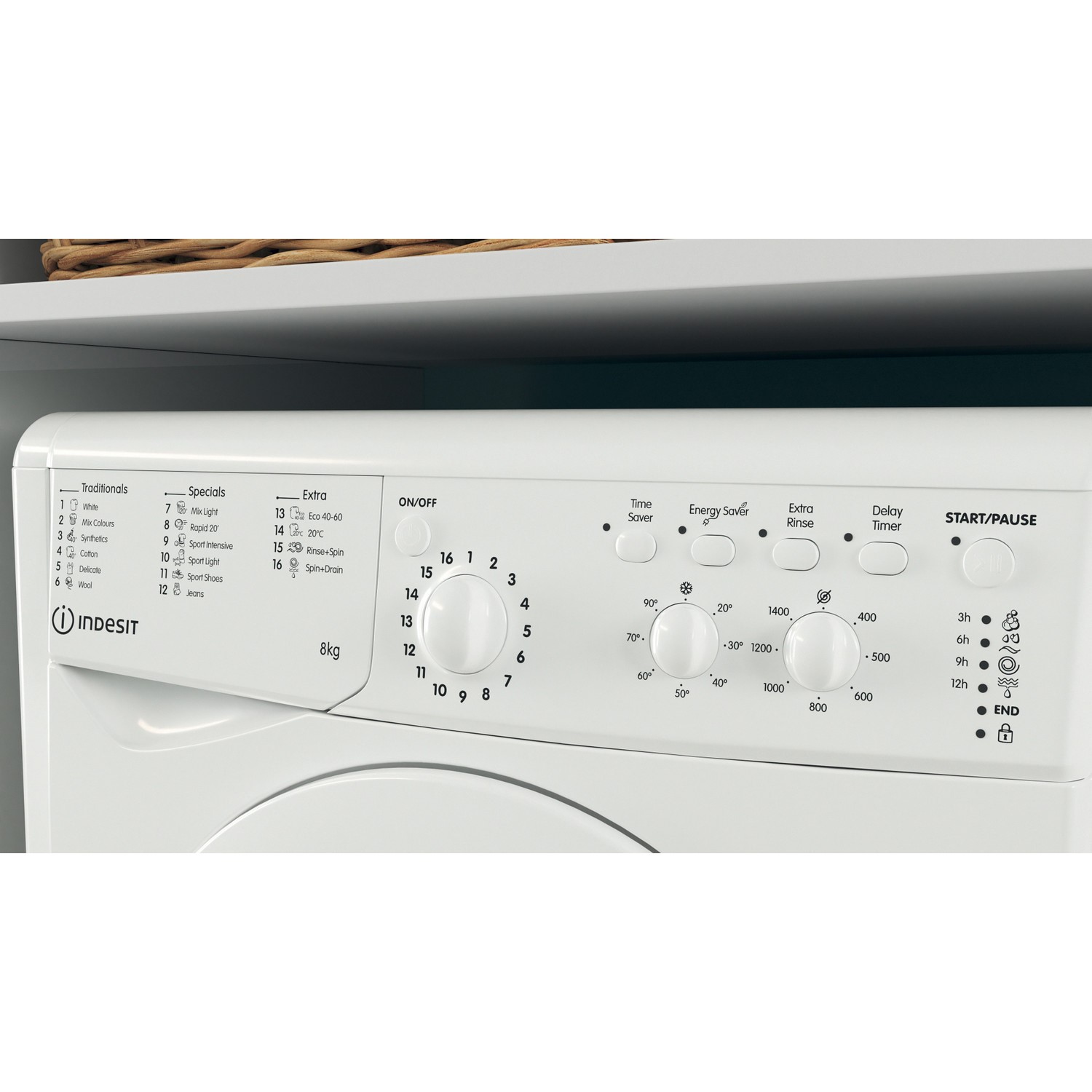 Making laundry a breeze while saving you time, money and effort, the Indesit IWC 81483 W UK N 8kg Washing Machine in White combines a generous capacity with 1400rpm of variable spin while staying resource conscious in everything the Indesit Ecotime IWC 81483 W UK N Washing Machine does, Water Balance Technology will adapt the amount of water used according to each cycle's need. Ensuring there's minimal wastage, it helps save money on your bills. Tackling hardy fabrics, jeans receive a dedicated cycle which puts the wash between their strong denim fibres to life out marks and stains.