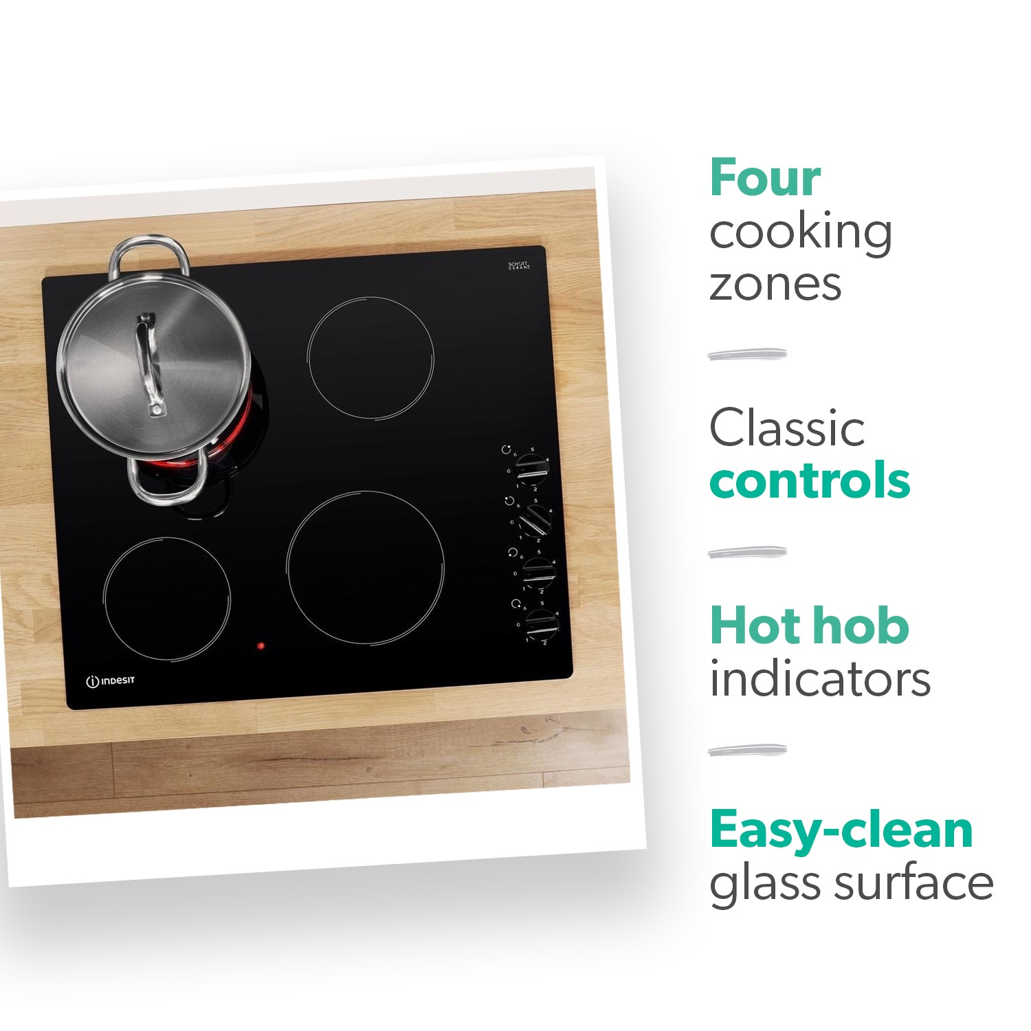 This stylish Indesit 4 Zone Ceramic Hob features an electric power supply with 6 power levels, plus a wipe-clean glass surface. The classic knob controls make operating this hob simple and intuitive.