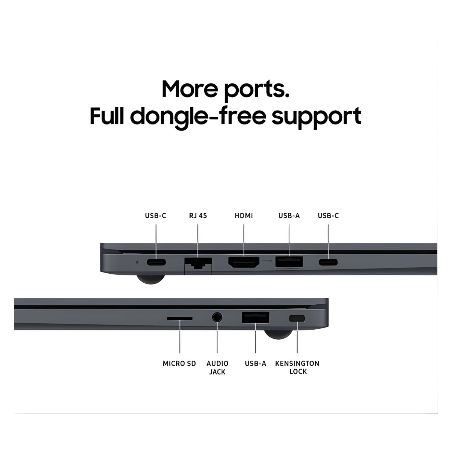 Slim yet mighty, Galaxy Book4 (2024) boasts a wide array of built-in ports to cover your connectivity needs. Plug in external devices via HDMI, two USB-A and two USB-C ports, microSD slot and even an RJ45 port for high-speed LAN connections.
