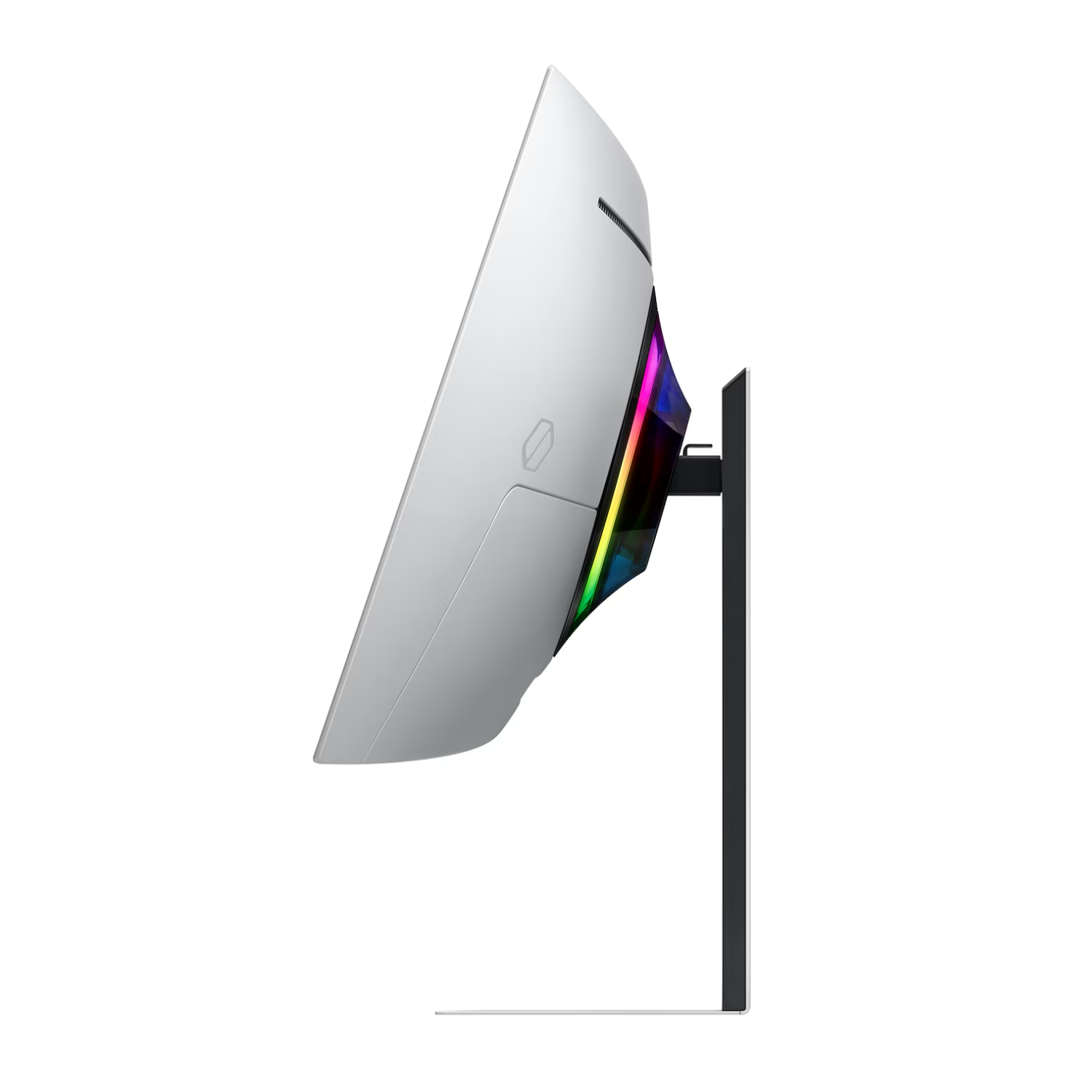 The LS34DG850SUXXU Samsung G8 gaming monitor includes tilt, height, and pivot adjustments for ergonomic comfort. Its sleek silver metal finish with ultra-thin design adds sophistication to gaming and professional setups.