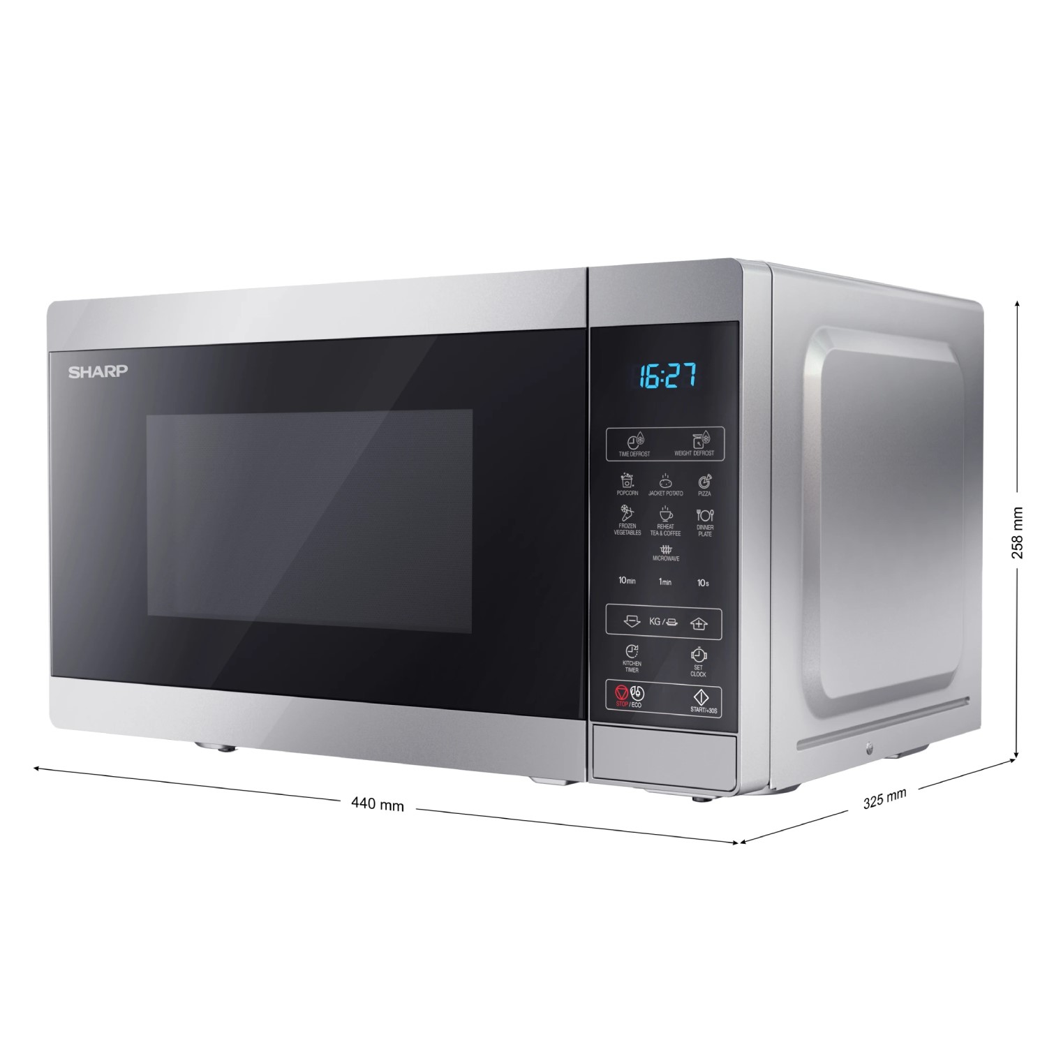 - Cooking – Features 8 cooking programmes: Popcorn, Jacket potato, pizza, frozen vegetables, reheat drinks, dinner plate, plus time and weight defrost