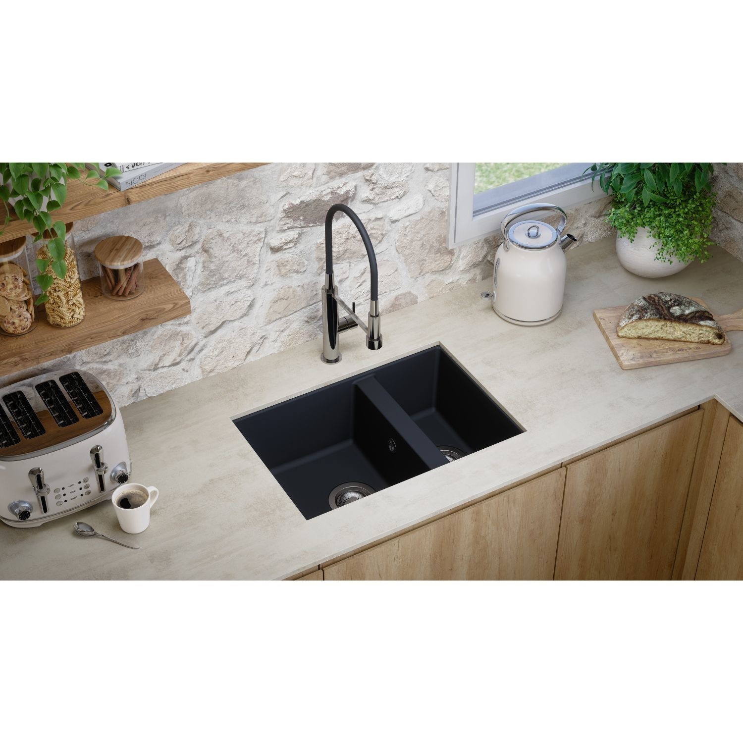 Upgrade your kitchen with the Weston 1.5 Bowl Black Composite Sink from RockLite. Suitable for both inset and undermount installation, this sink is lightweight, features a powder in mold coating (PMIC), and provides increased resistance to shocks, heat, and impacts for long-lasting performance. The 1.5 bowl design offers convenience for everyday kitchen tasks, providing a separate smaller bowl for rinsing or prepping. Comes with a complete waste kit and a 10-year warranty for peace of mind.