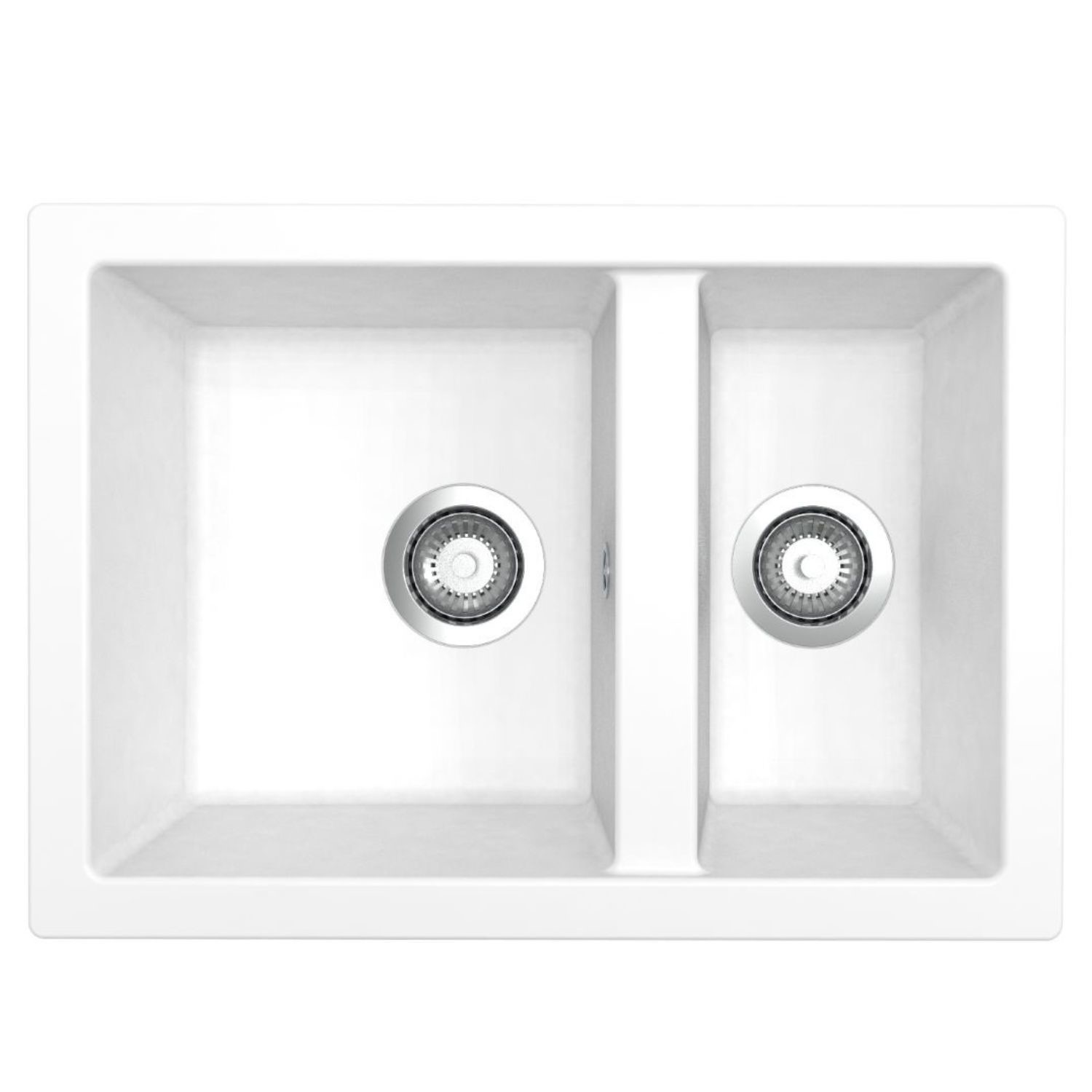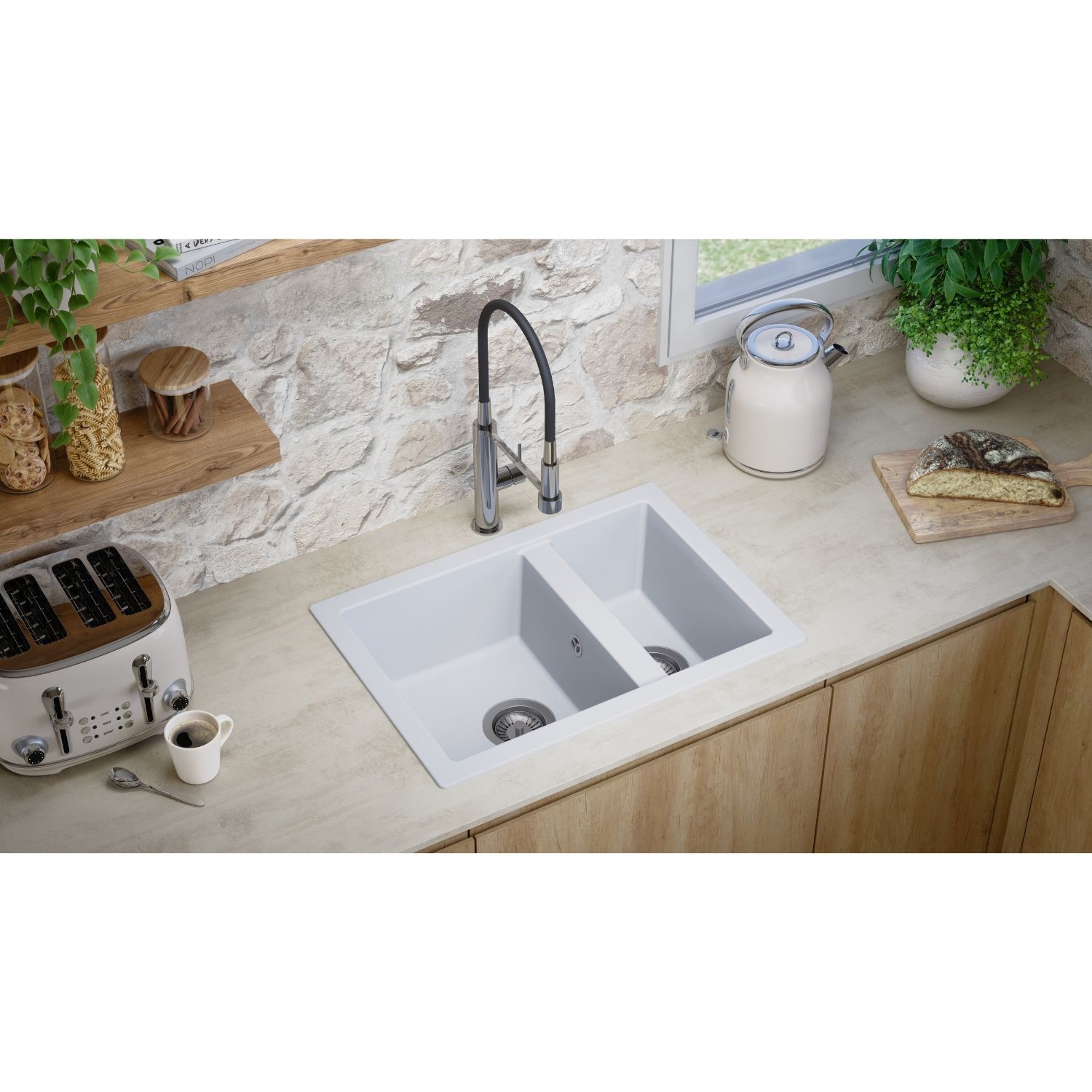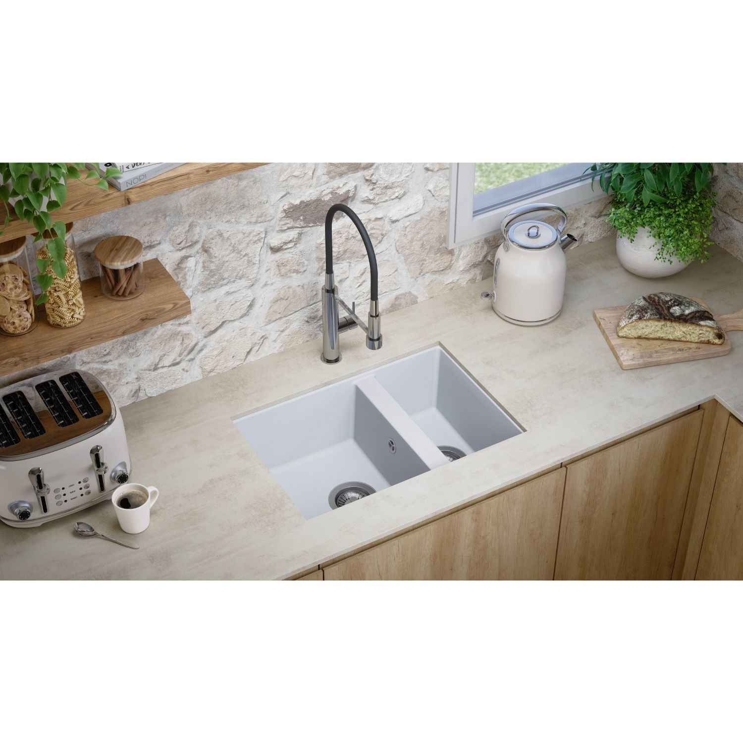Upgrade your kitchen with the Weston 1.5 Bowl White Composite Sink from RockLite. Suitable for both inset and undermount installation, this sink is lightweight, features a powder in mold coating (PMIC), and provides increased resistance to shocks, heat, and impacts for long-lasting performance. The 1.5 bowl design offers convenience for everyday kitchen tasks, providing a separate smaller bowl for rinsing or prepping. Comes with a complete waste kit and a 10-year warranty for peace of mind.