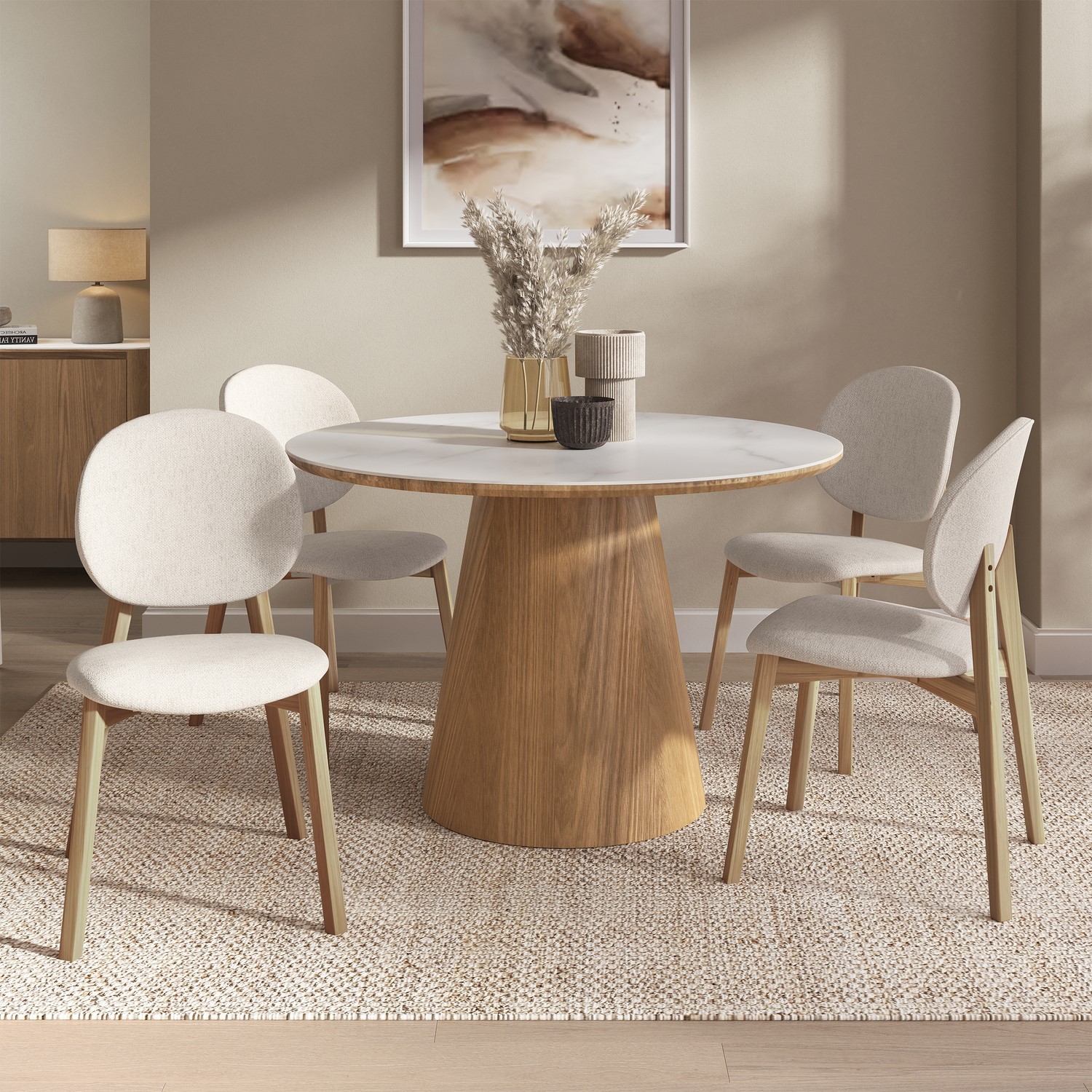 Bring luxury into your dining space with this modern round dining set. The stunning white matte marble-effect ceramic tabletop combined with a sculptural oak wooden pedestal base, creates a bold yet sophisticated centrepiece. Paired with Leona soft cream fabric upholstery dining chairs, a supportive curved backrest, and a padded seat for superior comfort. Crafted with sturdy oak legs, they bring elegance and practicality to your home and together with the Malia dining table, this set brings lasting sophistication and elevated practicality to modern dining spaces. Whether hosting dinner parties or enjoying daily meals, this elegant round dining set elevates your home décor effortlessly.