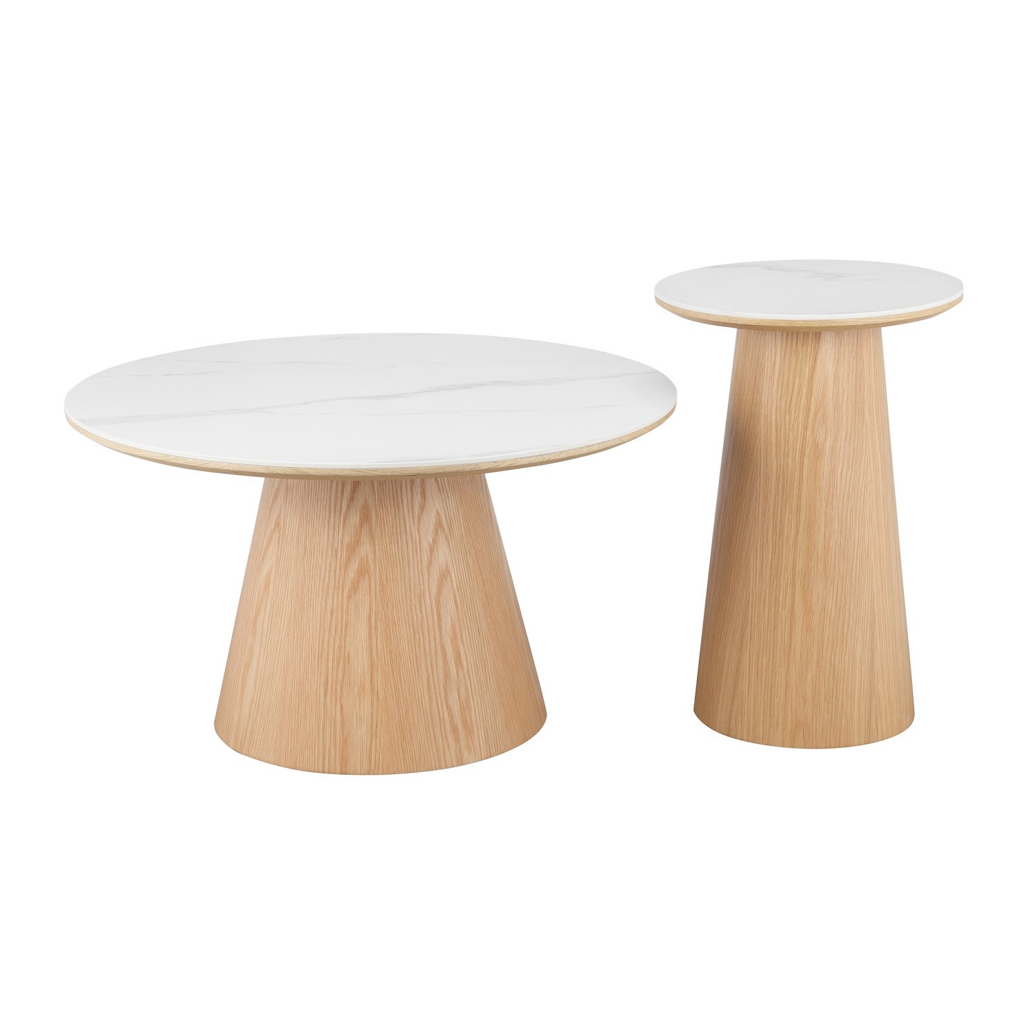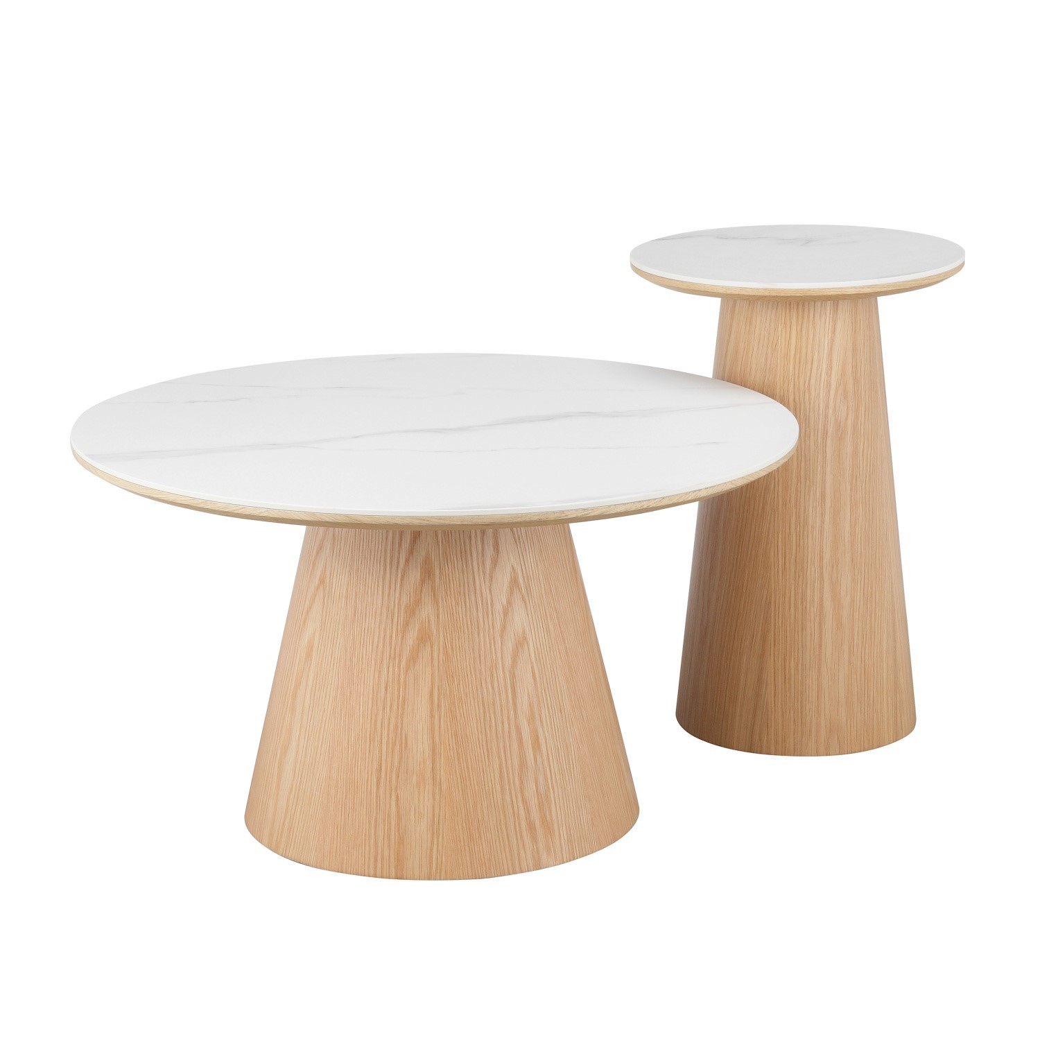 The Malia Nest of Tables set combines a stylish coffee table and side table, effortlessly blending modern sophistication with mid-century charm. Each piece features a white matte marble effect ceramic top that is not only striking but also heat and scratch-resistant, making it ideal for everyday use. Supported by a sleek oak pedestal base, these tables offer durability and elegance. The unique ceramic surface adds a refined, distinctive touch to any living area, making the Malia tables both a practical and eye-catching addition to your home.