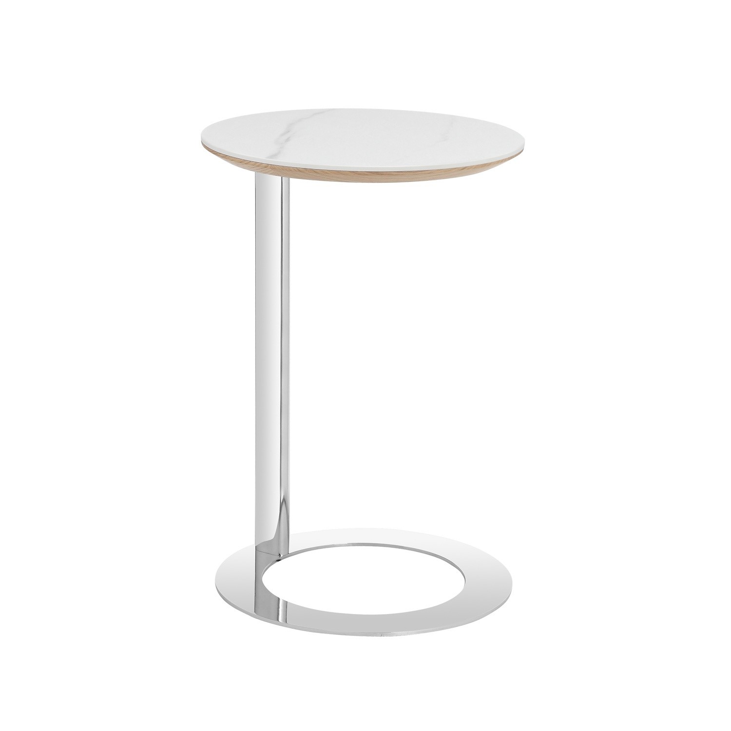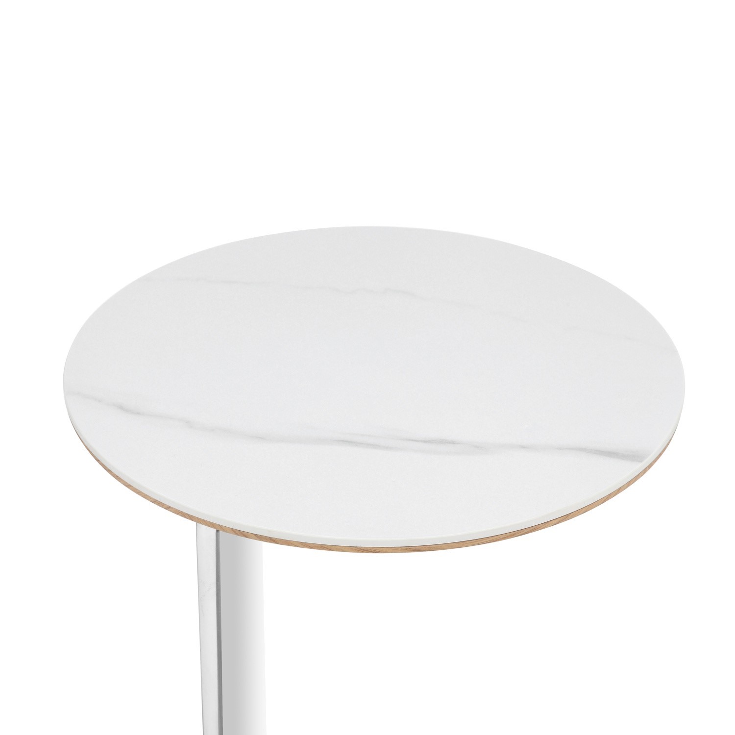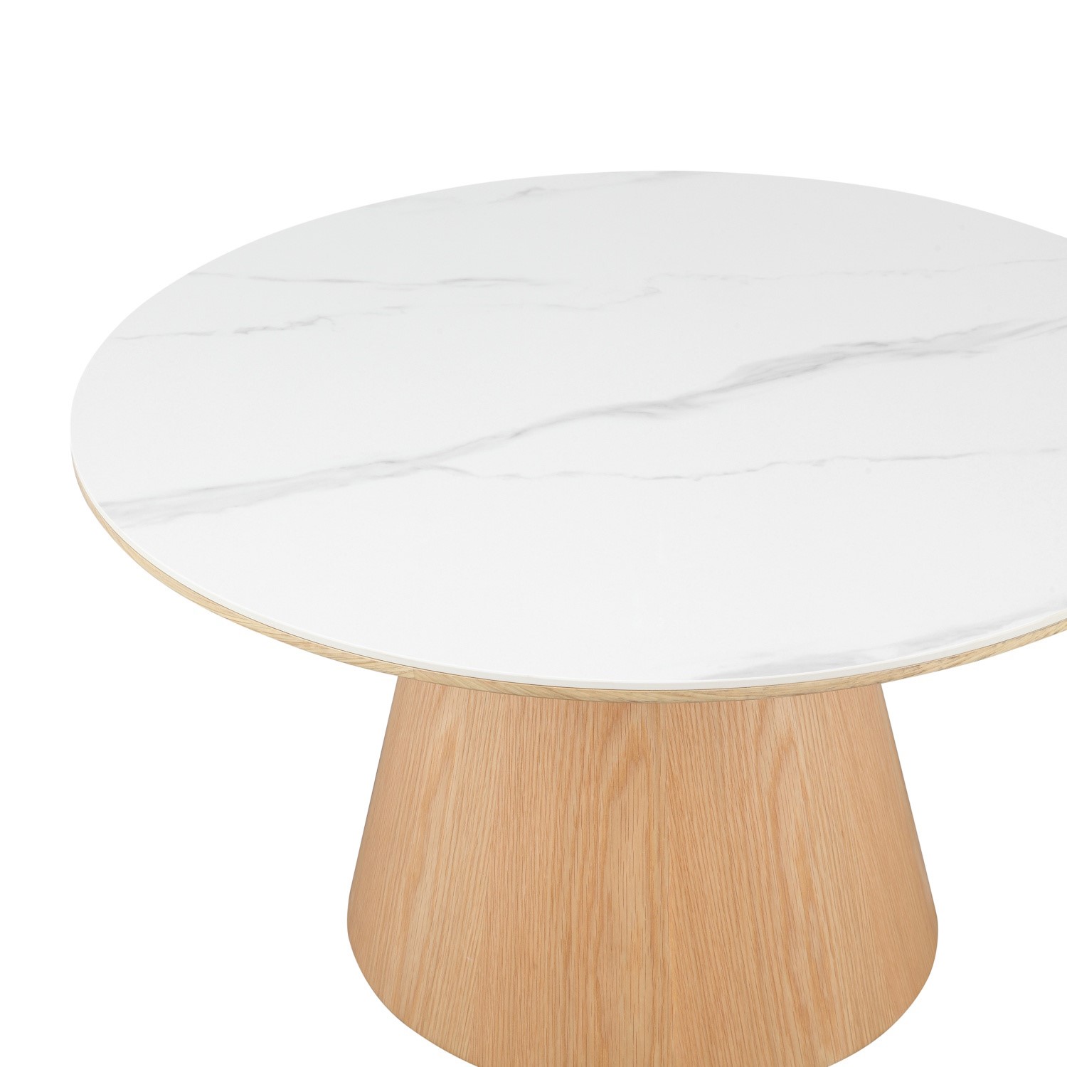 Each piece features a white matte marble effect ceramic top that is not only heat and scratch-resistant which brings practicality to your living space. The coffee and side tables showcase oak pedestal bases, infusing natural warmth and mid-century charm into your decor. In contrast, the chrome metal base of the sofa table adds a sleek modern touch, creating a balanced yet cohesive aesthetic throughout the set.