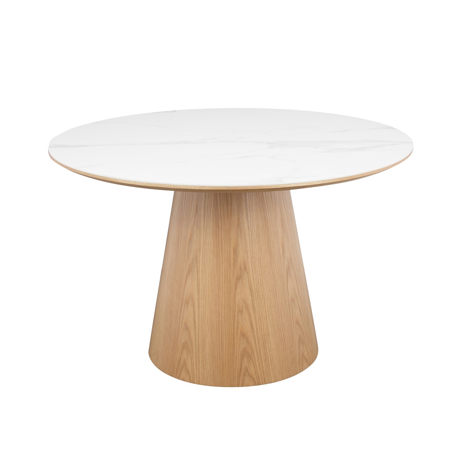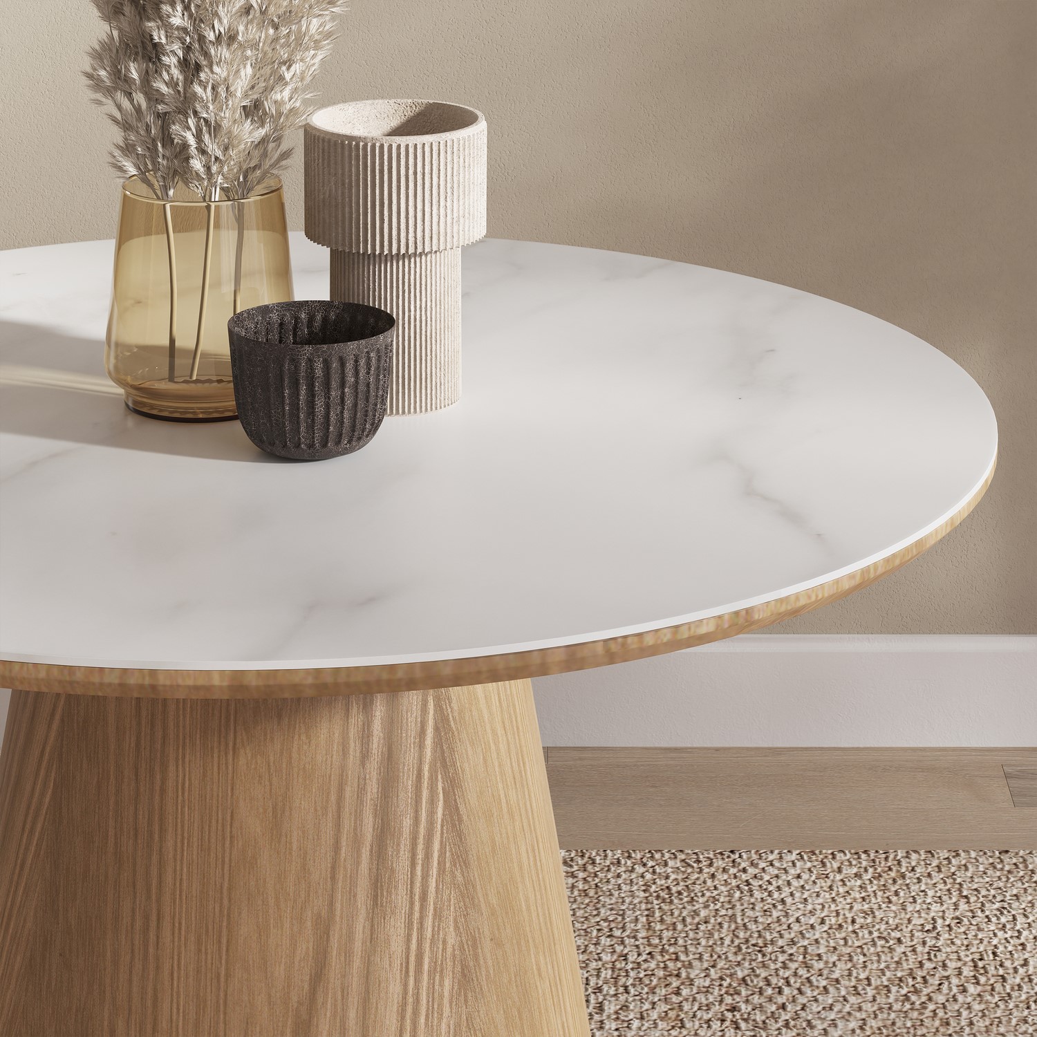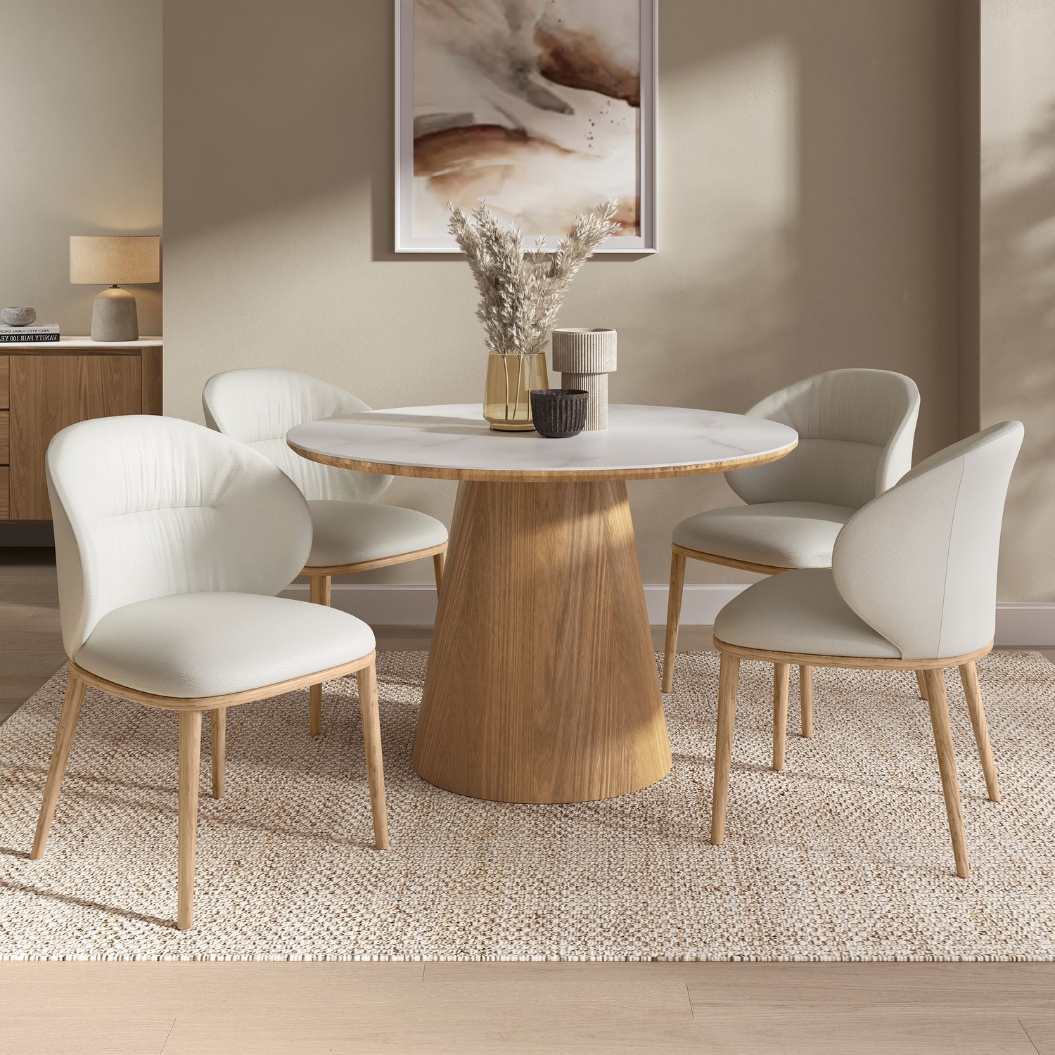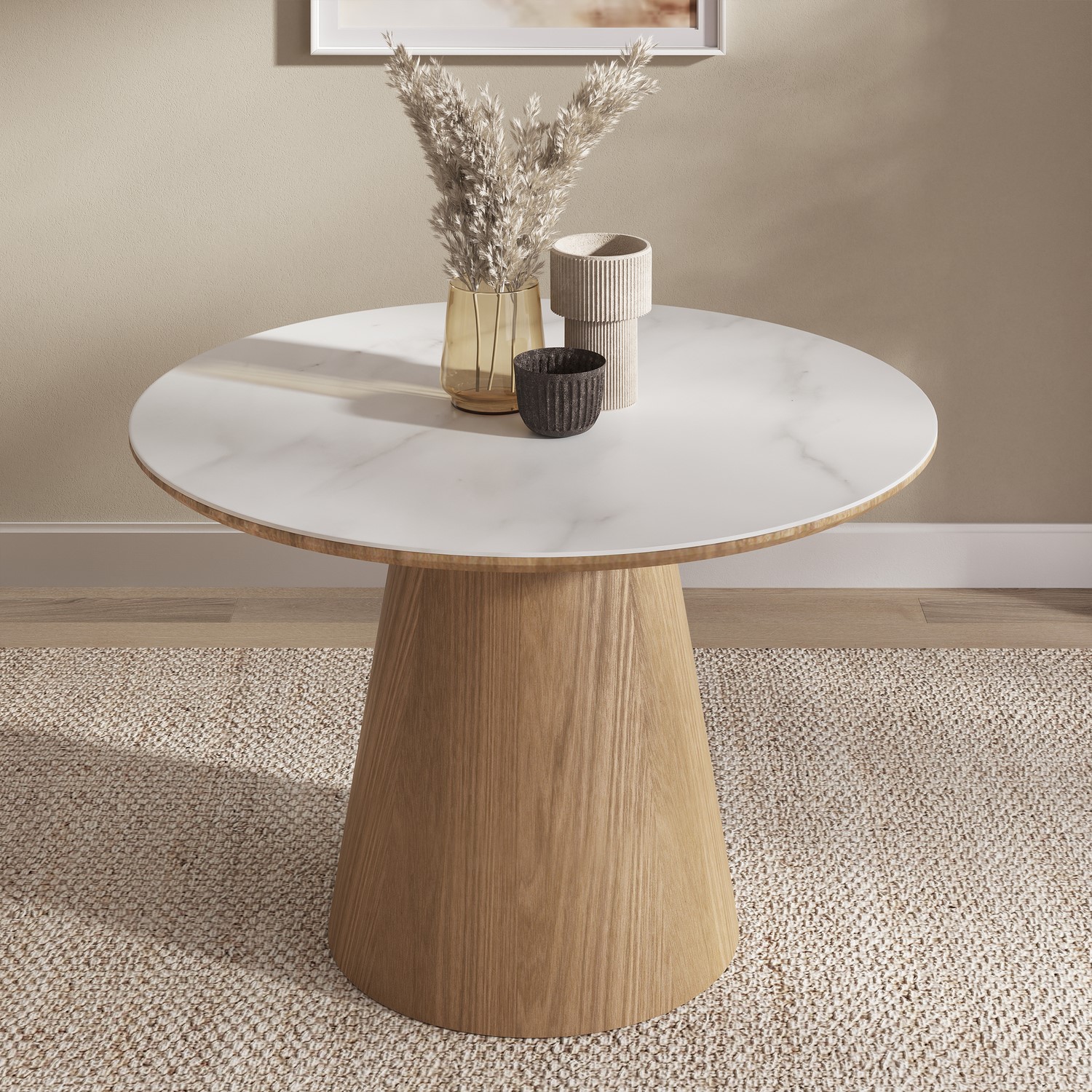 The Malia Dining Table combines modern design with luxury, featuring a white matte marble effect ceramic top that’s both heat and scratch-proof, set on a sleek oak pedestal base. Its 119.5cm round surface comfortably seats four, making it a stylish and durable centerpiece for any dining space.