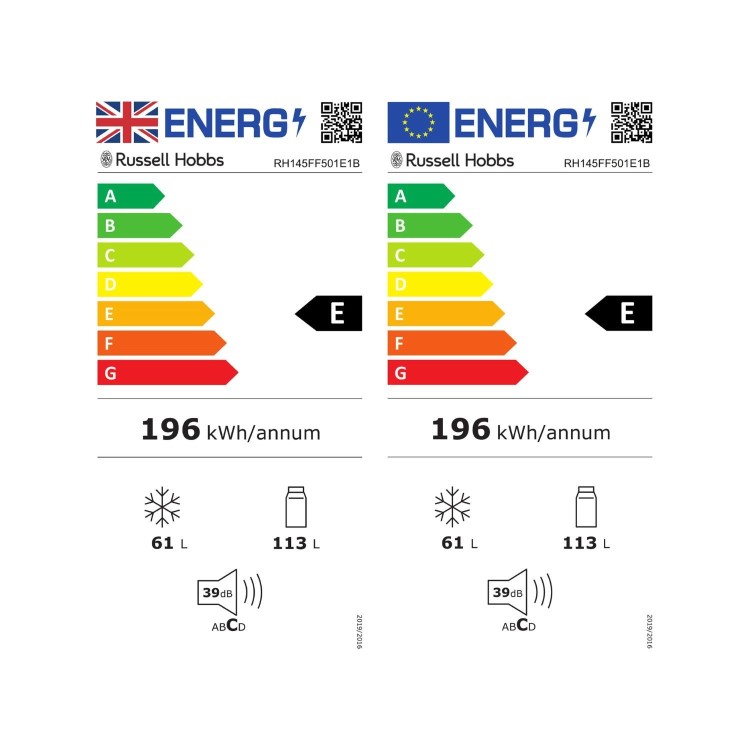 This Russell Hobbs Low Frost Fridge Freezer is functional and contemporary in a simple design. The fridge freezer has an impressive 174L capacity split into 113L of fridge space and 61L of freezer space. Made up of 3 glass shelves, 3 door racks and a crisper compartment, the fridge space offers plenty of room for your fresh produce. Plus, the 61L freezer compartment is a great space to stock up on your favourite frozen treats and your batch-cooked family favourites. The low frost technology means there's less ice build-up in the freezer compartment so that it’s always quicker and easier to defrost. The freezer features 3 drawers to help keep your favourite frozen treats organised. Plus, the built-in LED light in the fridge compartment makes midnight snacking even easier. The adjustable thermostat ensures that your fridge freezer is always set to the perfect temperature. Even better, the appliance has an E energy rating which means it’s super eco-friendly. Not only does the fridge freezer help cut your energy bills, but the freezer compartment offers you the space to stock up on more pocket-friendly frozen food. For added peace of mind, this Russell Hobbs Low Frost Fridge Freezer comes with a 2 Year Guarantee upon registration. This way, in the unlikely event something goes wrong, you know we'll always be on hand to help.