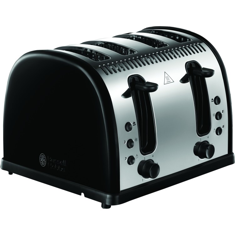 - Black stainless steel toaster with Russell Hobbs logo embossed