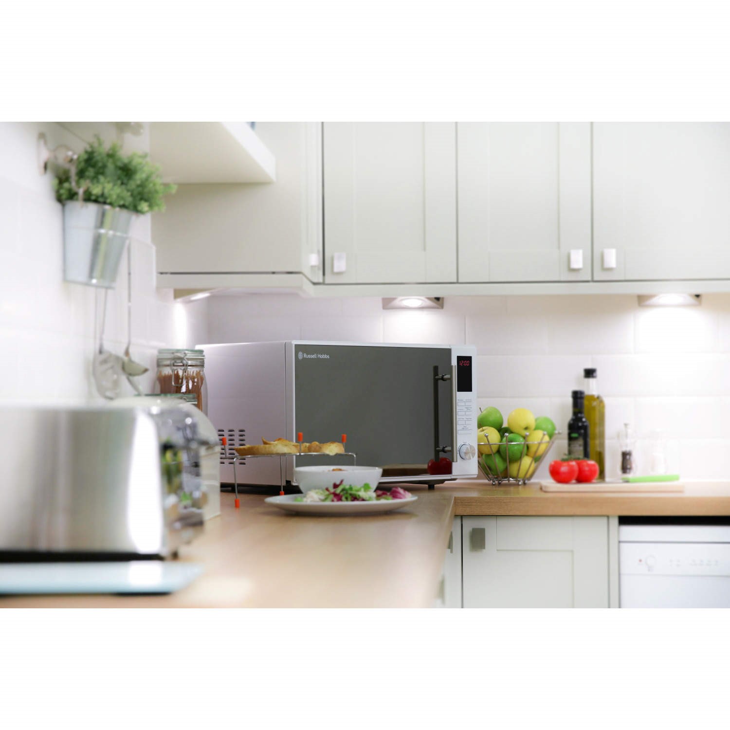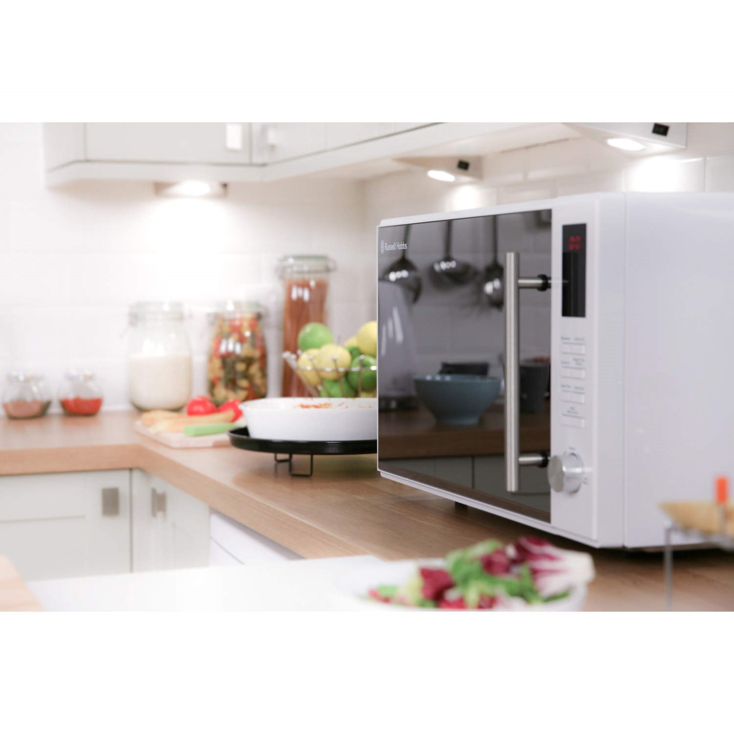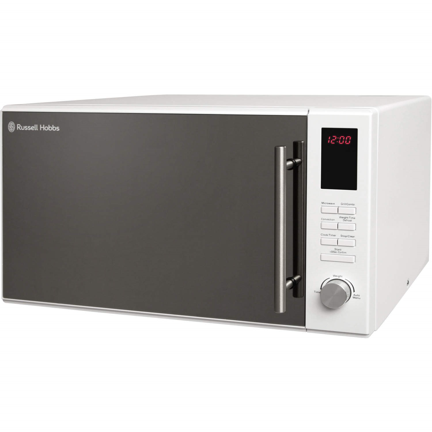 This large 30 capacity litre Russell Hobbs Microwave features a stylish and professional design with a mirrored door finish. It combines microwave cooking with grill power and convection oven enabling you to cook a variety of dishes with just one appliance. The combination aspect enables you to combine microwave energy, a grill, and convection heating (fan assisted) so you can heat, roast, crisp and brown. Ideal for cooking lasagnes, pizzas, baked potatoes and cottage pies.
