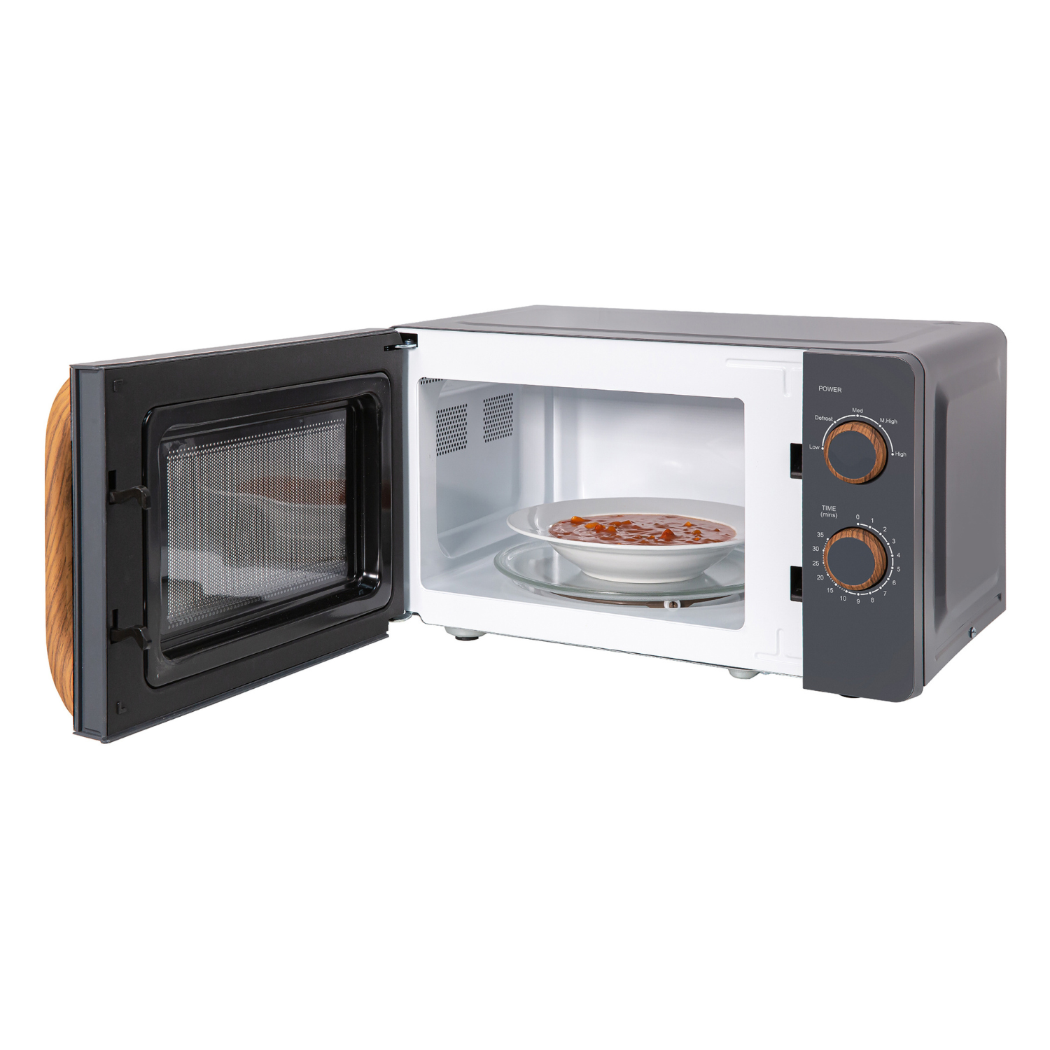 - Wooden effect handle and dials
