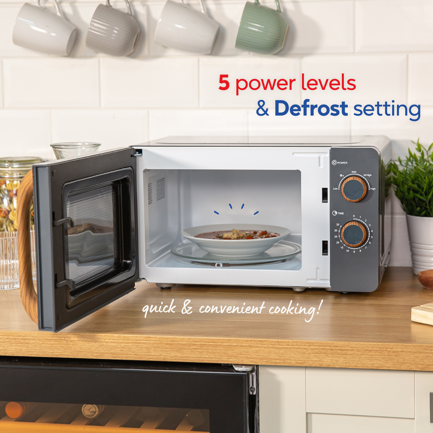 - 5 microwave power levels and a defrost setting