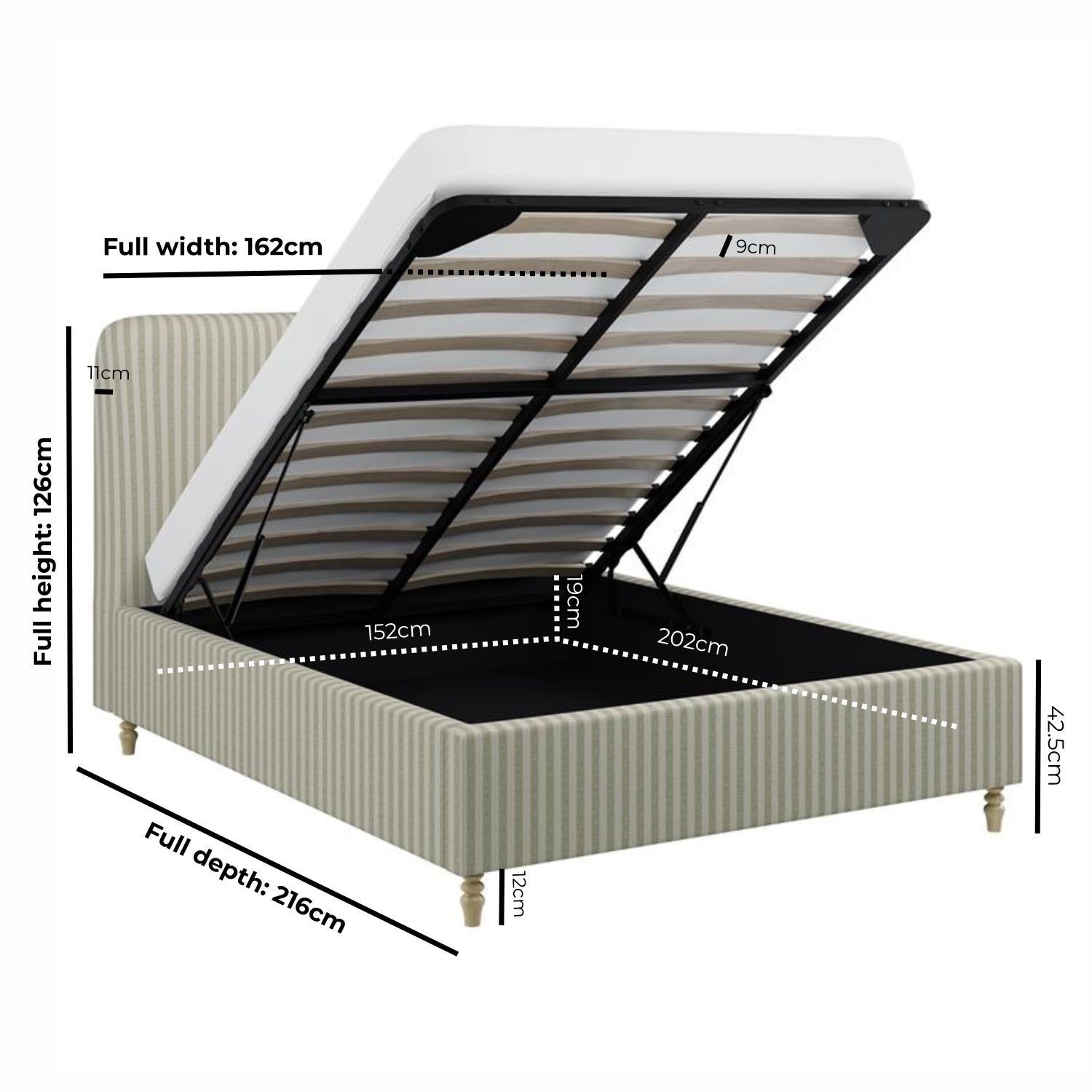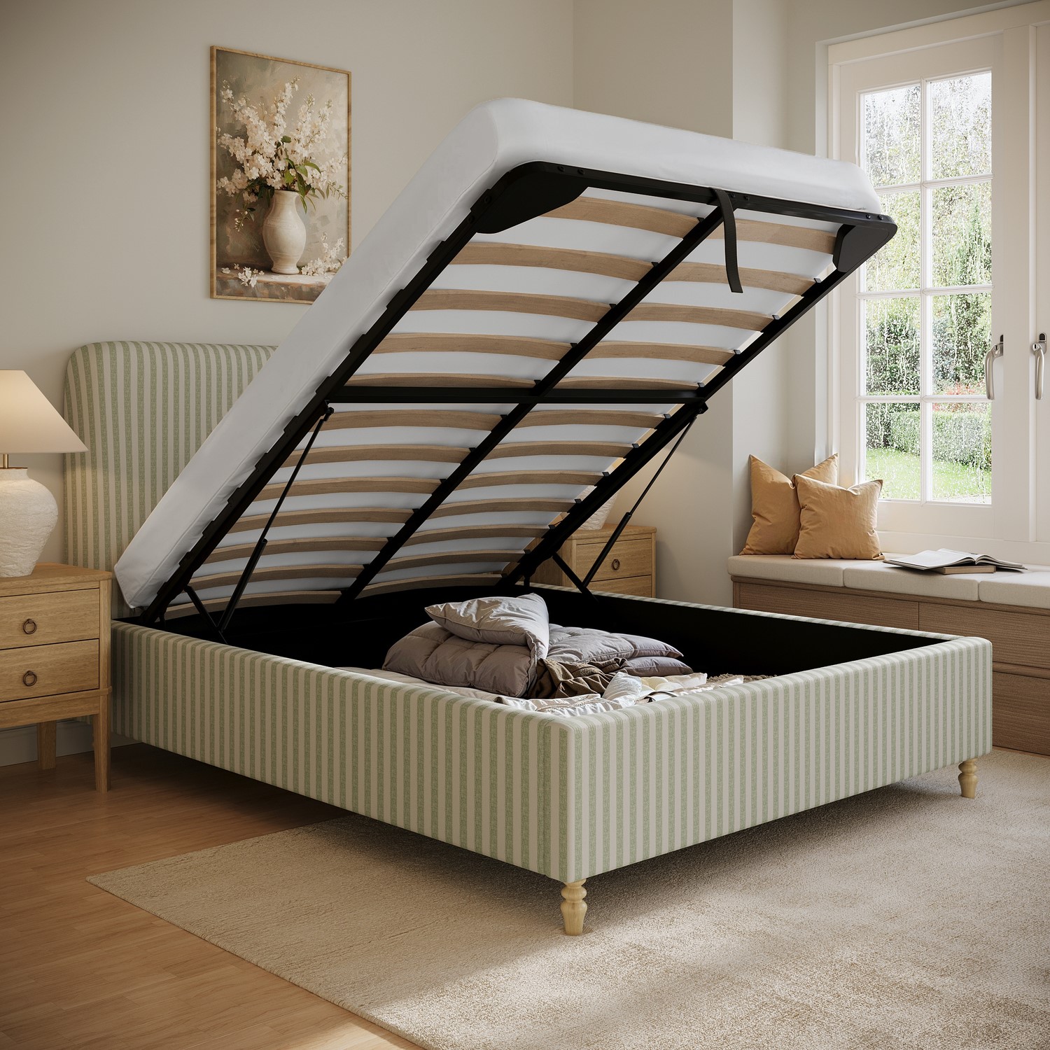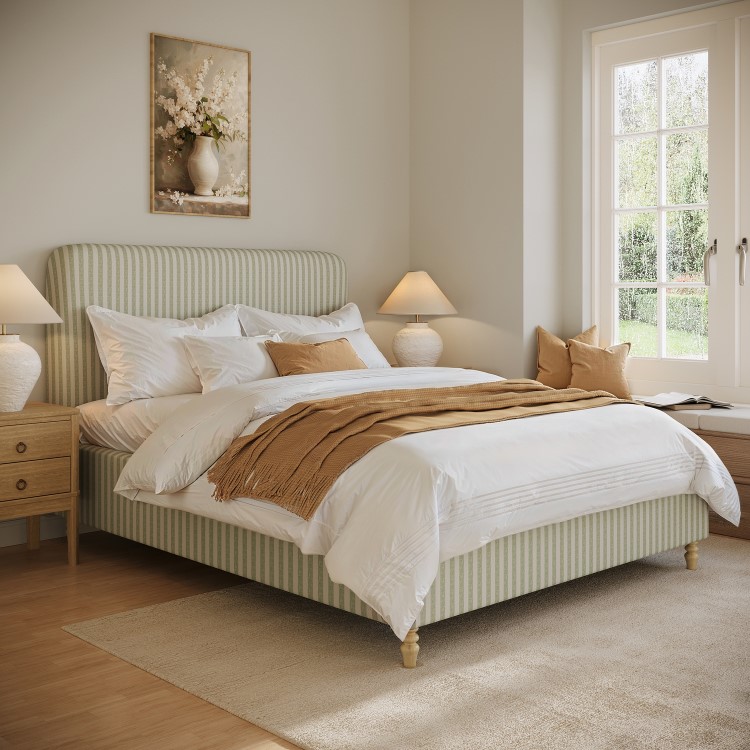 The Farrow Ottoman Bed combines timeless design with everyday practicality. Upholstered in soft, durable ticking stripe chenille, its cream and sage tones create a light, airy aesthetic that feels both classic and on-trend, complementing modern and traditional interiors alike. A softly curved headboard enhances the design, adding style and comfort, while the elegant turned beech wood legs in a natural finish bring warmth and durability. The easy end-lift gas mechanism provides effortless access to a spacious, solid wood storage base, perfect for neatly storing bedding, clothes, or seasonal items. It has a sprung slatted base for flexible mattress support and improved airflow for a cooler, more comfortable night’s sleep. This bed fits a UK standard king-size mattress, which is not included, giving you the freedom to pair it with a mattress of your choice.