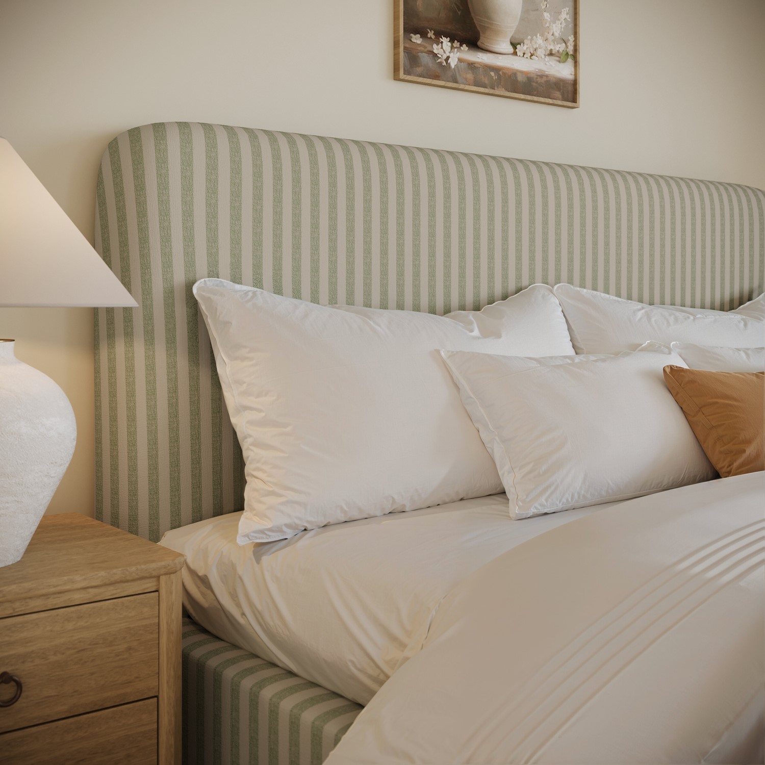 Soft Curved Headboard: Upholstered in luxurious chenille with timeless cream-and-sage stripes, the softly curved headboard adds comfort, elegance, and versatility to suit both modern and traditional homes.