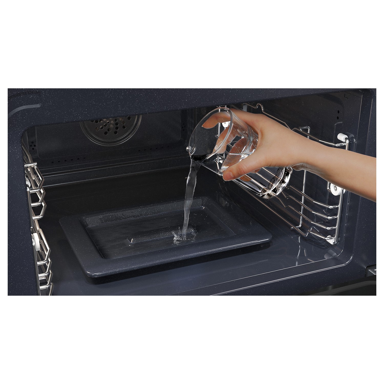 Cleaning your oven should be as easy as cooking with it. And it is, thanks to Steam Cleaning. Just pour water in, press the steam clean, then wipe away the residue with a cloth. And voila – the inside of your oven looks good as new.