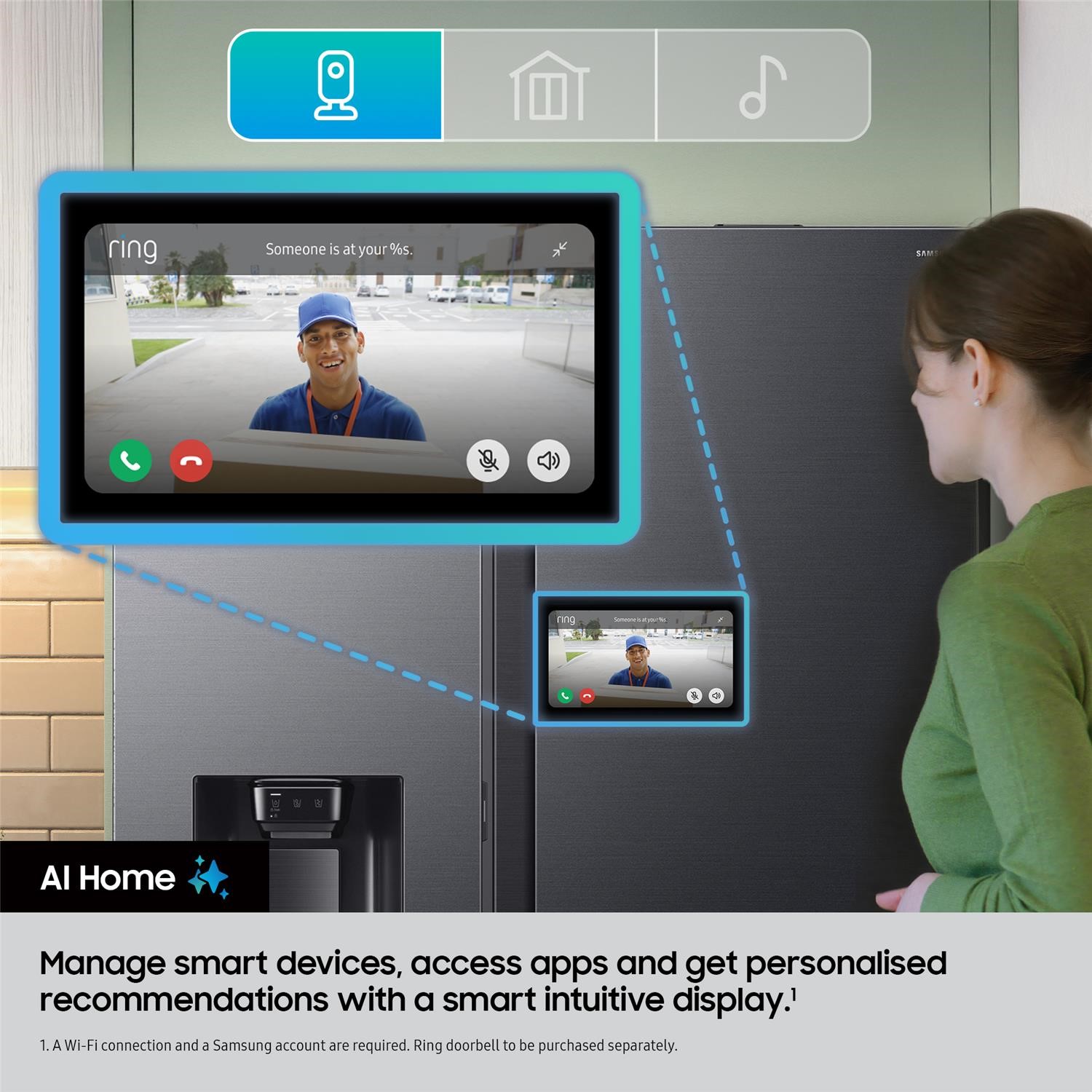 Get smart in your kitchen with AI Home. Manage smart device, access apps, and get personalized info from a sleek 9" LCD screen activates with your touch, while enjoying seamless interaction powered by Bixby. With built in SmartThings Hub, control connected devices without extra hardware.