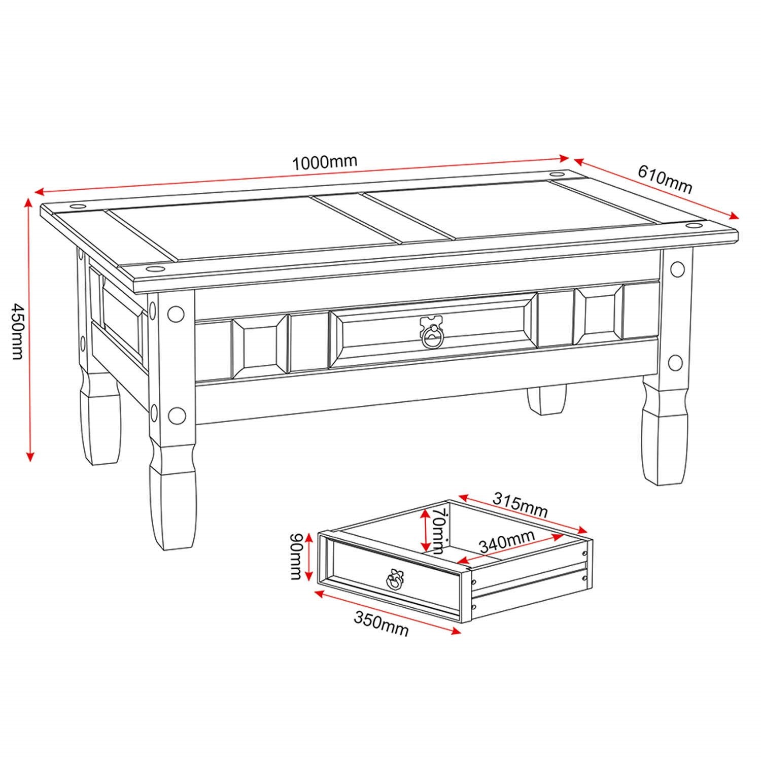 The Corona coffee table is made from pine, giving you a hardwearing, sturdy piece. The draw bottom is plywood and the drawer runners are pine. All hardware is metal with an iron effect finish.