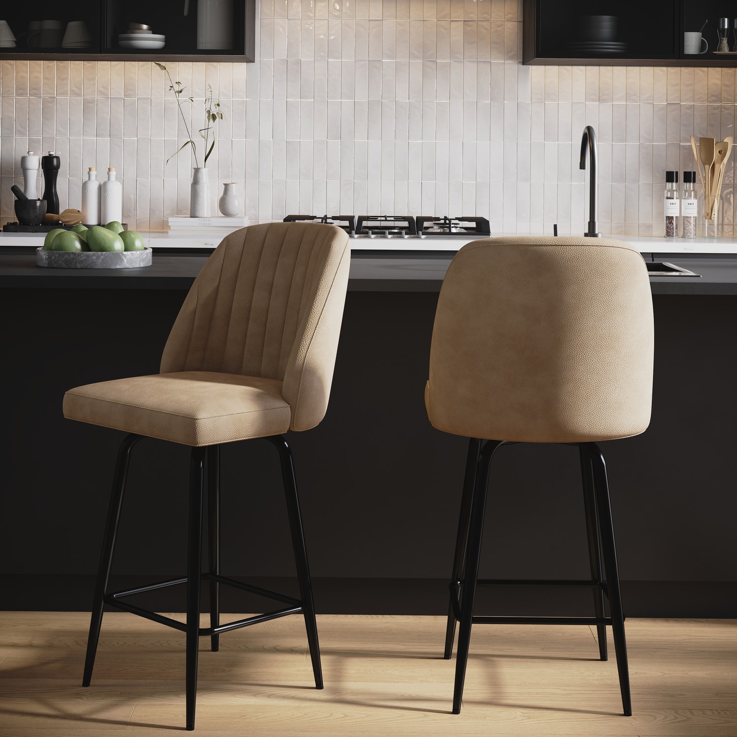 The Logan kitchen stools combines space-saving practicality with modern design. Perfect for smaller kitchens, the swivel seat makes it easy to slide in and out, while the tall, slightly curved backrest supports your posture during everyday use. Finished in beige faux leather with subtle vertical stitching, it’s both stylish and versatile. Black metal legs offer a sleek contrast and durable foundation, making these stools a smart and lasting addition to your kitchen. Complete your space with matching items from the Logan range.