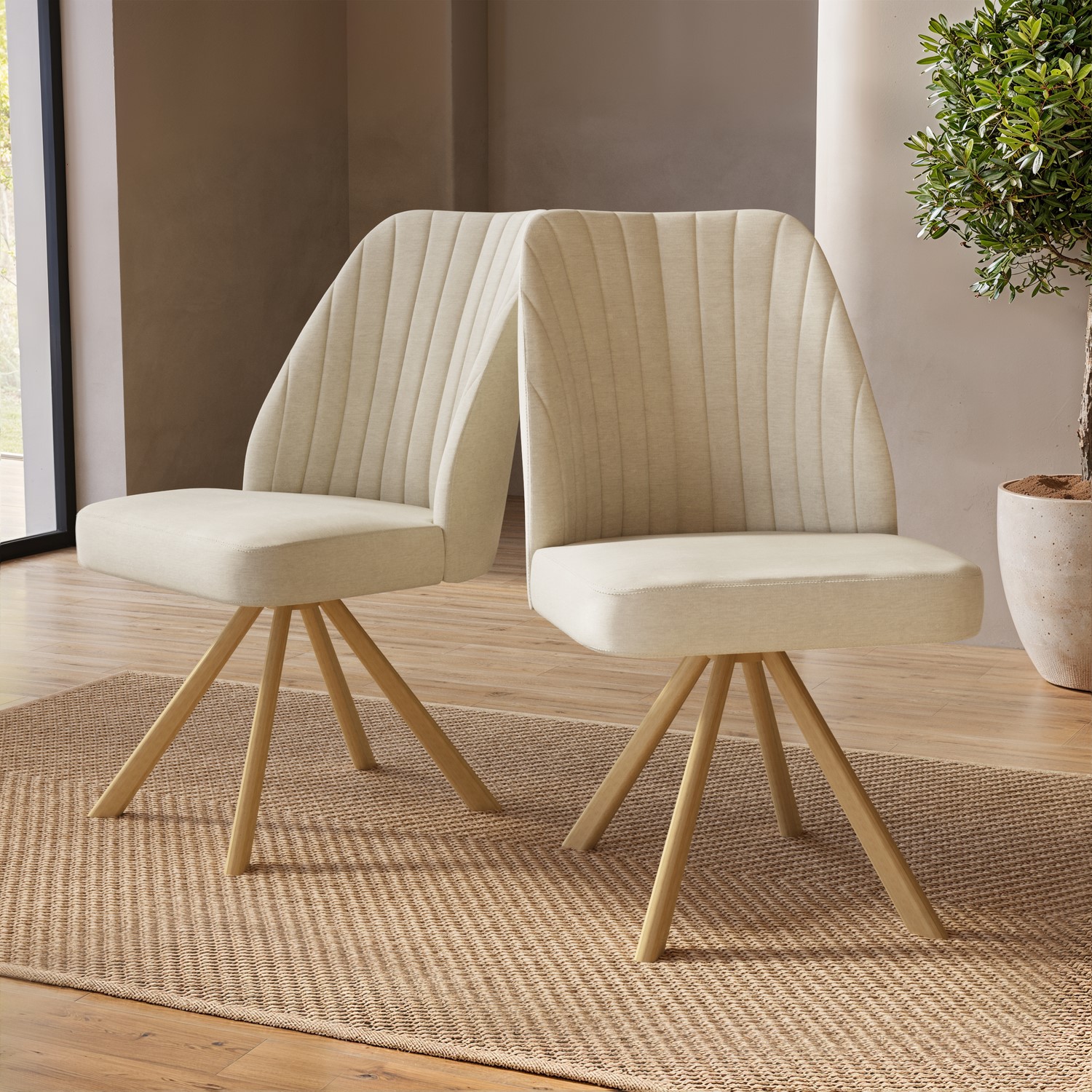 The Logan swivel dining chairs in beige fabric are a perfect blend of style and practicality. Their curved backs and vertical stitch detailing create a clean, modern silhouette, while the light wood legs lend a soft, natural feel that complements both classic and contemporary interiors. The 360° swivel base with auto-return means each chair resets itself when not in use, keeping your space effortlessly tidy. Upholstered in soft beige fabric and generously padded, they offer the comfort you need for everyday meals or entertaining guests.