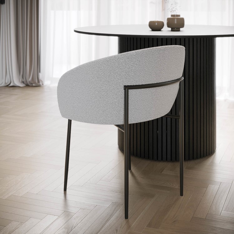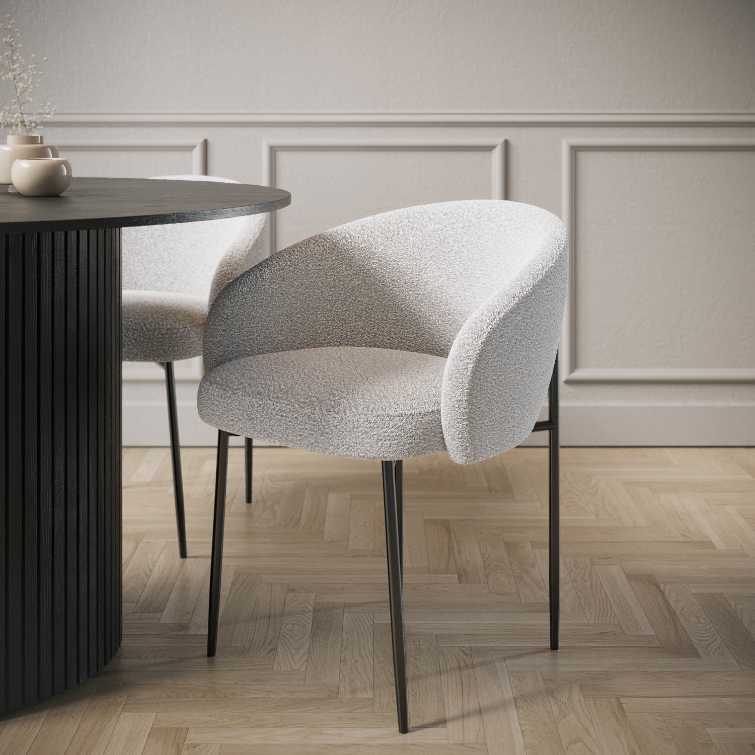 These Cora dining chairs make the perfect addition to any dining room. The white boucle fabric matches any neutral interior, and the matt black legs and unique frame contrast beautifully. Pair with any of our dining tables to complete the look. Design features exposed back detailing, adding a touch of modern elegance to your dining room. On trend low curved back shaping for ultimate comfort