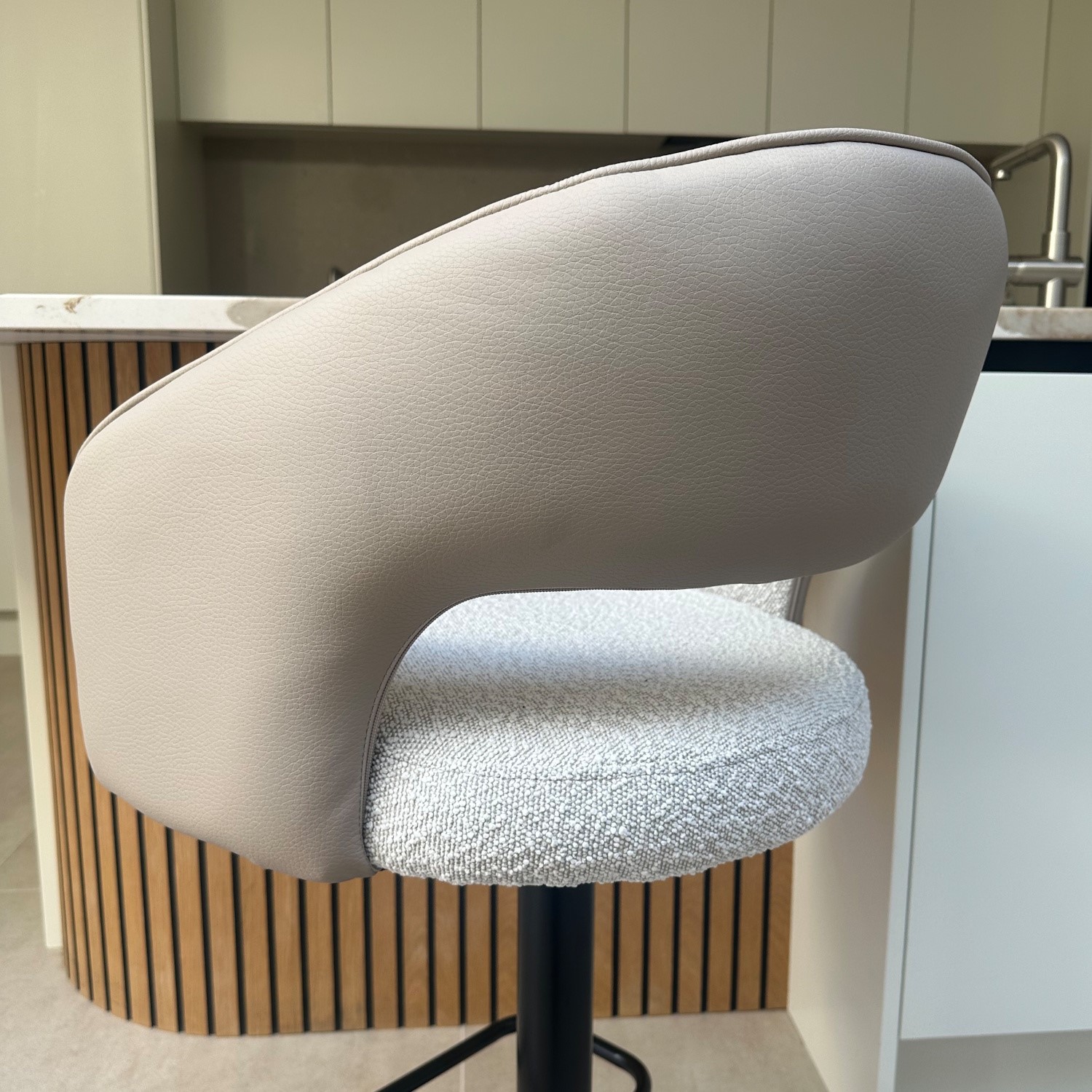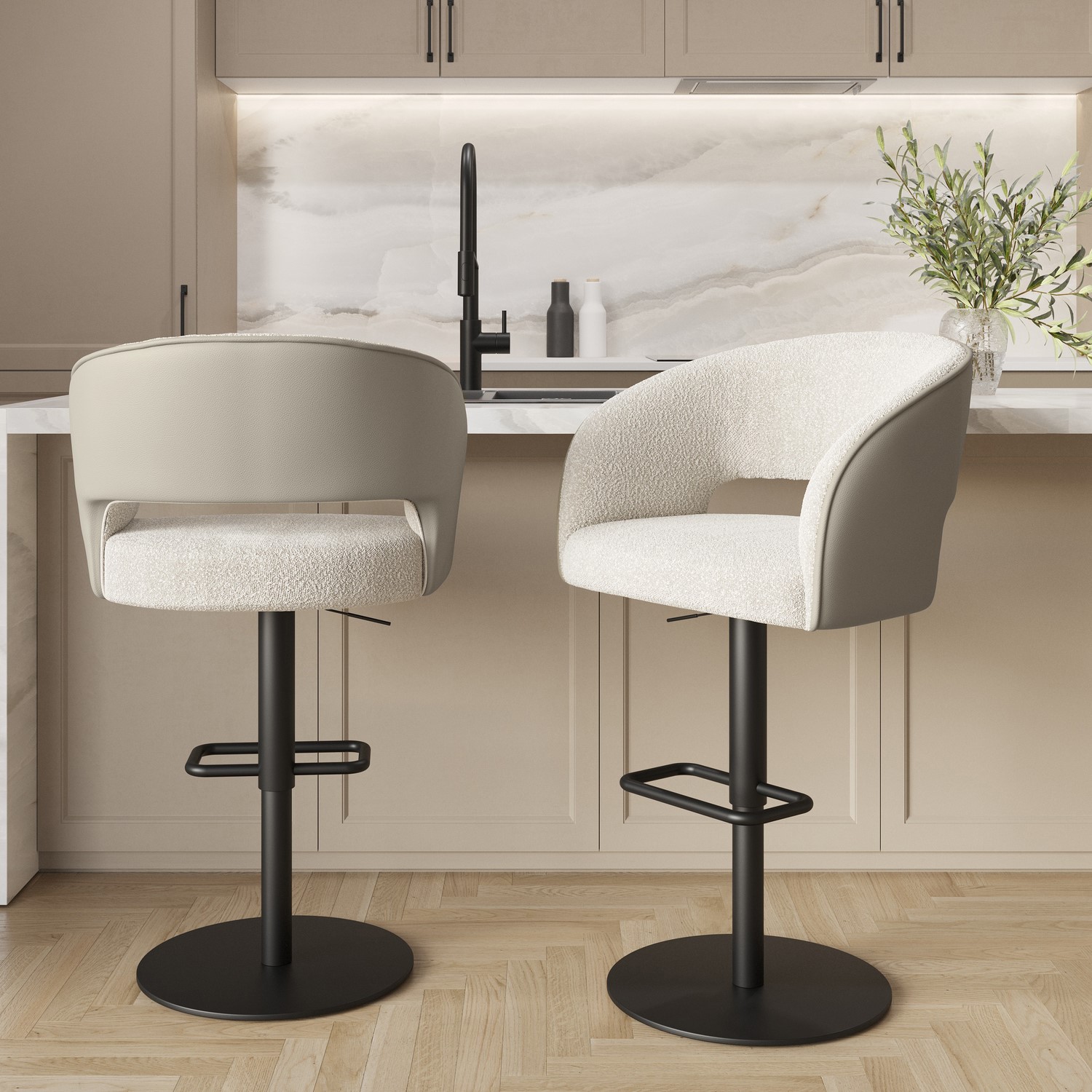 Premium Mixed Fabric Upholstery: Upholstered in a stunning combination of beige faux leather and boucle fabric, this bar stool offers a textured, high-end look with a soft, inviting feel.