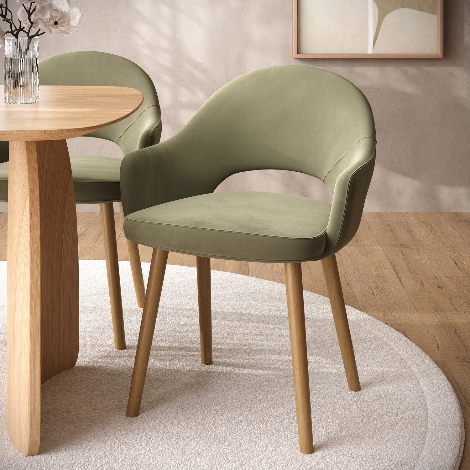 This pair of Colbie chairs is the ideal combination of style and versatility, suiting a dining room setting or as occasion chairs for bedrooms and more. Sophisticated in their design, they can provide the finishing touch you've been striving for. Upholstered in a sage green velvet and finished off with sleek oak legs, these chairs offer a timeless design and comfortable dining experience.