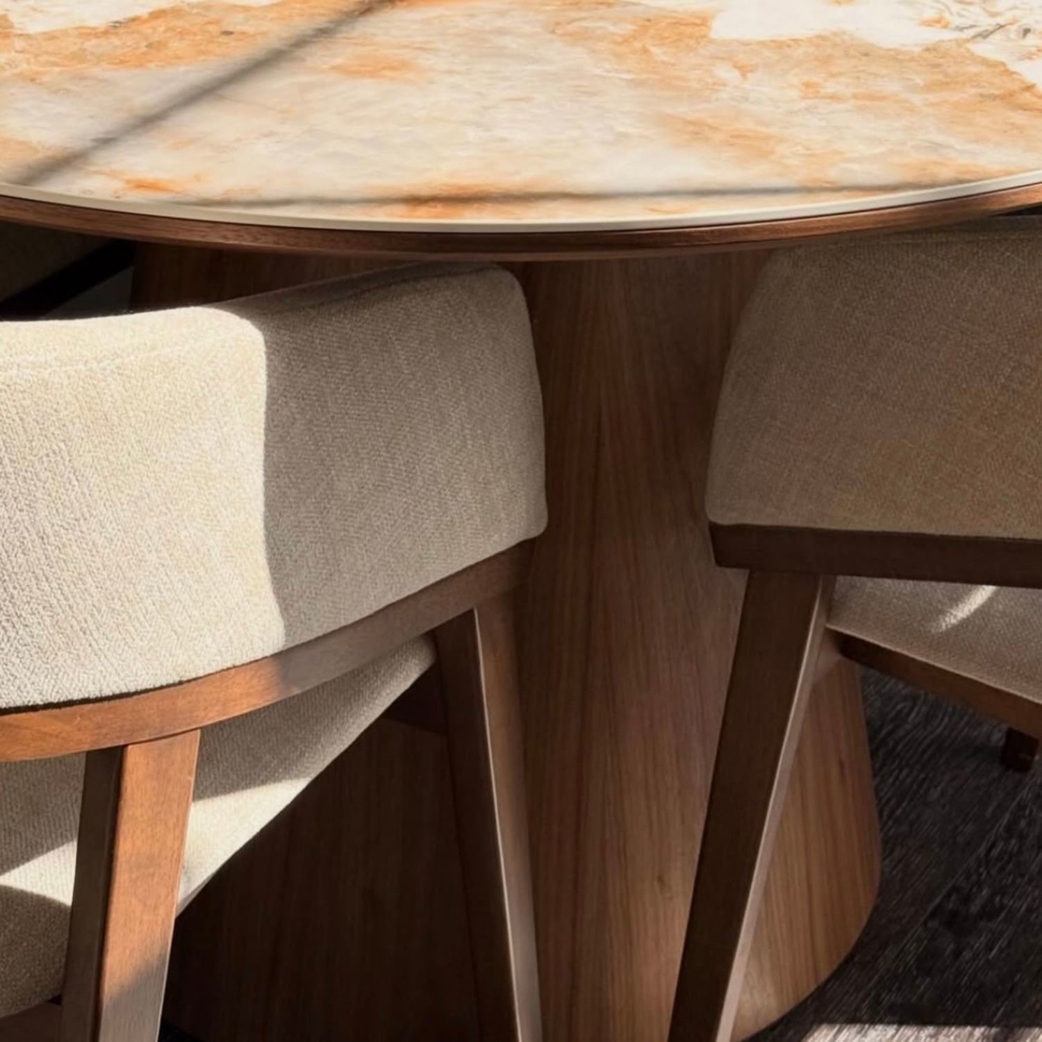 Plush Beige Upholstery: The beige fabric upholstery provides a soft, inviting seat for dining or relaxing.
