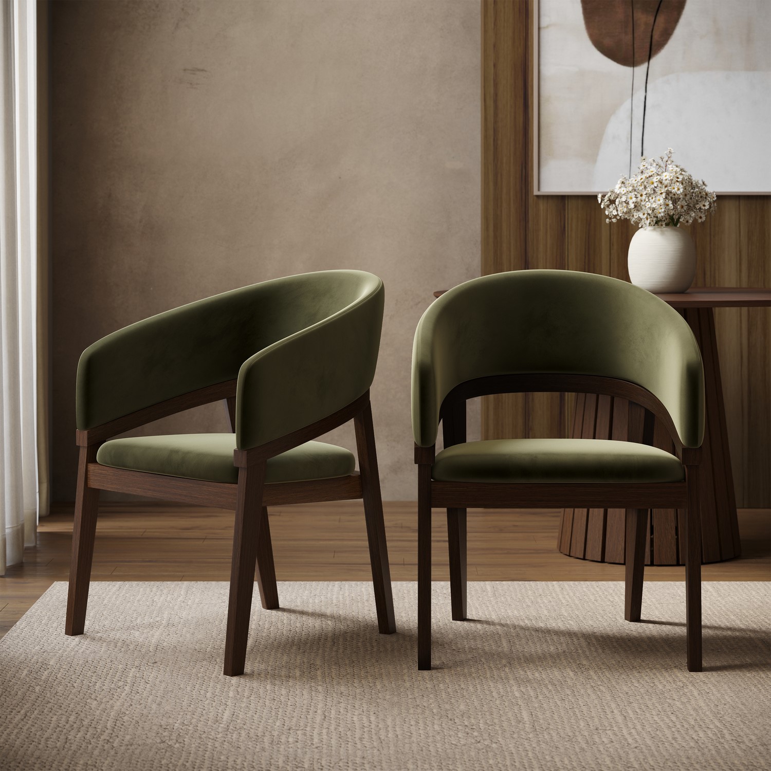 Upgrade your dining space with these curved dining chairs. Featuring an elegant cut-out and curved backrest design, these chairs blend modern sophistication with everyday comfort. The plush olive green velvet upholstery and padded back and armrests are perfect for long dinners or casual gatherings. Built for durability, the solid wood frame with a walnut-stained finish adds warmth and stability, making these chairs a long-lasting addition to your home.