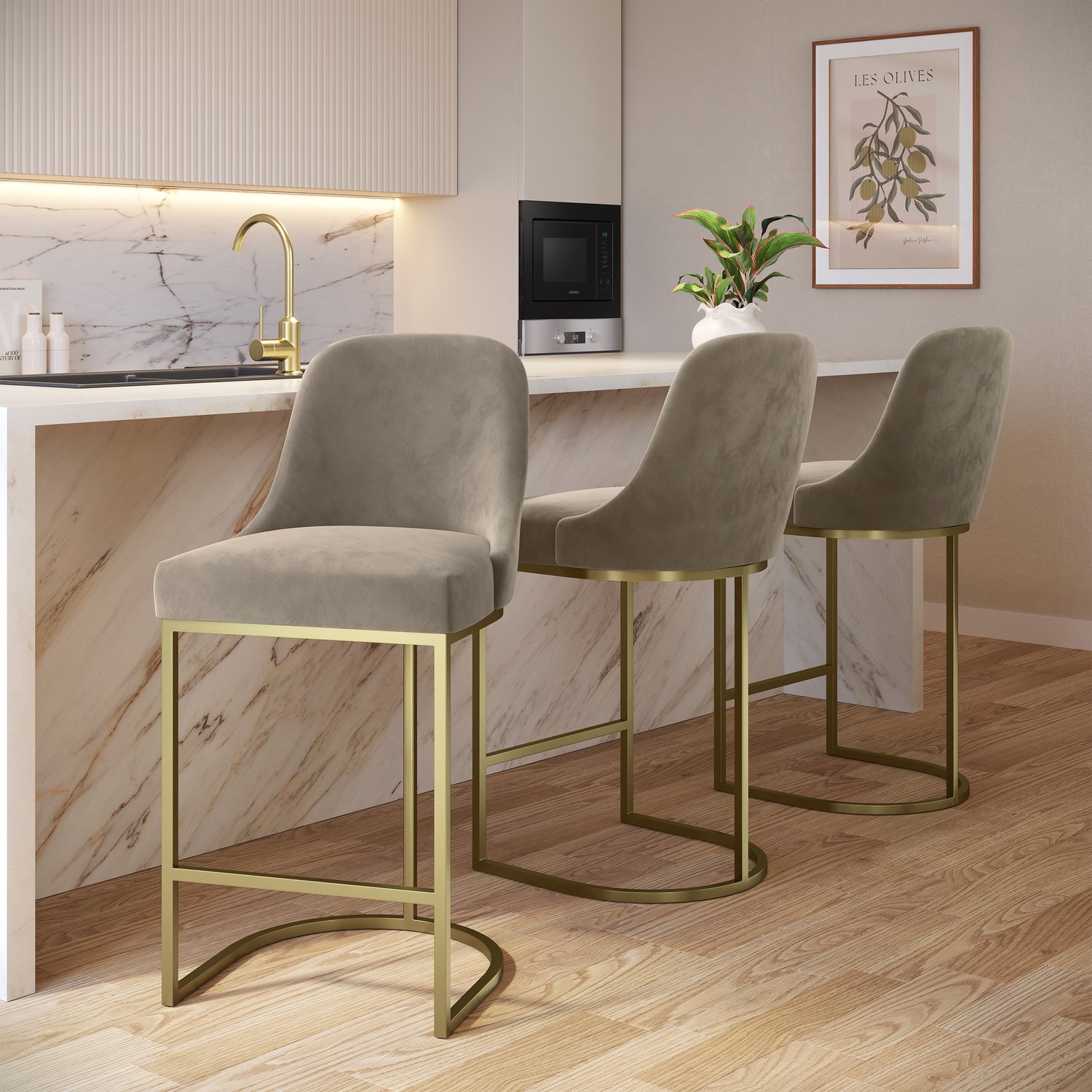 Elevate your kitchen or breakfast bar with these elegant mink velvet kitchen stools, designed to combine modern luxury with everyday comfort. The mink velvet upholstery brings a warm, inviting feel, while the sleek gold metal frame adds a sophisticated touch that instantly enhances your space. A gently curved backrest and deeply padded seat ensure supportive, comfortable seating, perfect for enjoying meals and drinks. Finished with a built-in footrest for added stability and ease, this stool offers the ideal blend of style and practicality. Whether styled as a single statement piece or grouped for a cohesive look, it brings refined charm and contemporary elegance to any home.