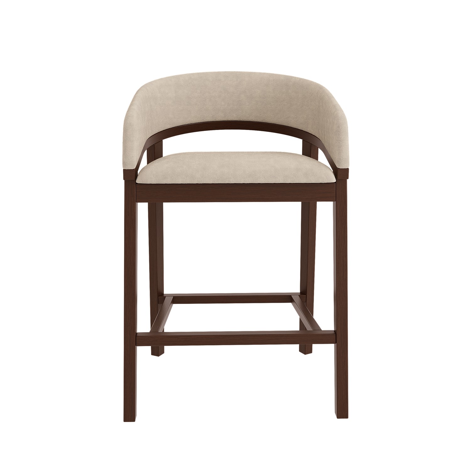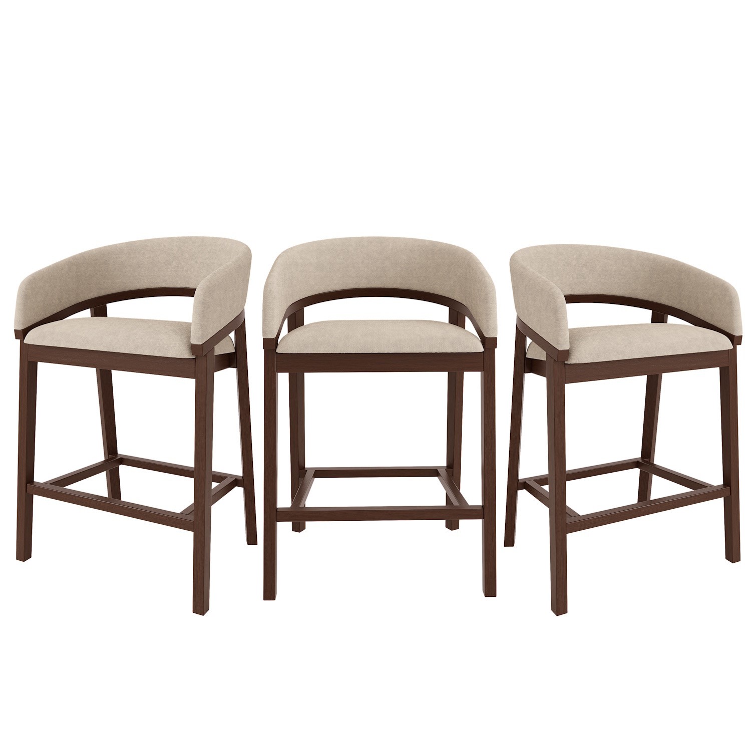 Upgrade your kitchen space with this contemporary curved kitchen stools. Designed with a cut-out backrest and gently curved armrests, it blends modern sophistication with everyday comfort. The soft beige fabric and plush padding create an inviting seat, whether you're enjoying a quick breakfast or entertaining guests. Supported by a sturdy solid wood frame in a warm walnut-stained finish, these stools not only offers a refined aesthetic but also delivers exceptional durability for daily use.