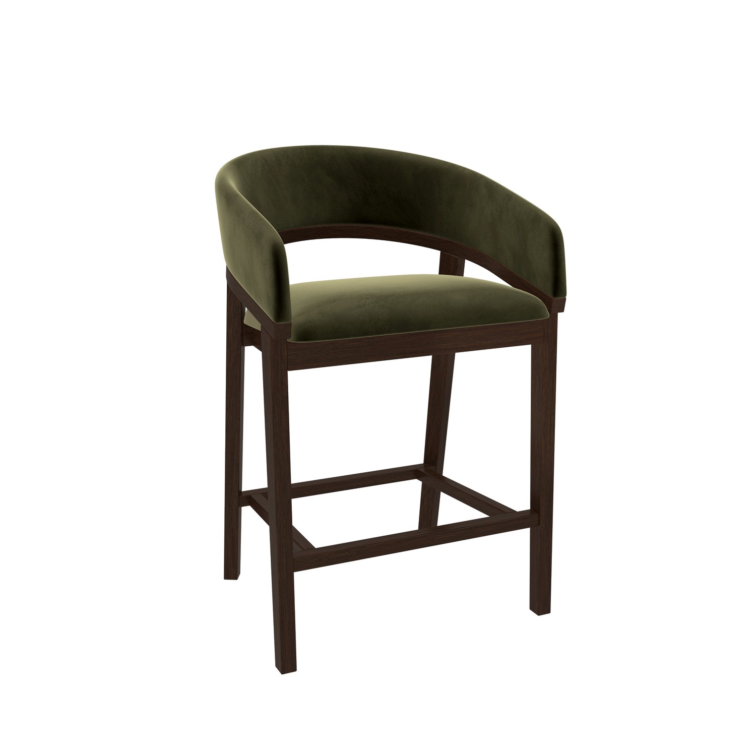 Upgrade your kitchen space with this contemporary curved kitchen stools. Designed with a cut-out backrest and gently curved armrests, it blends modern sophistication with everyday comfort. The soft olive green fabric and plush padding create an inviting seat, whether you're enjoying a quick breakfast or entertaining guests. Supported by a sturdy solid wood frame in a warm walnut-stained finish, these stools not only offers a refined aesthetic but also delivers exceptional durability for daily use.