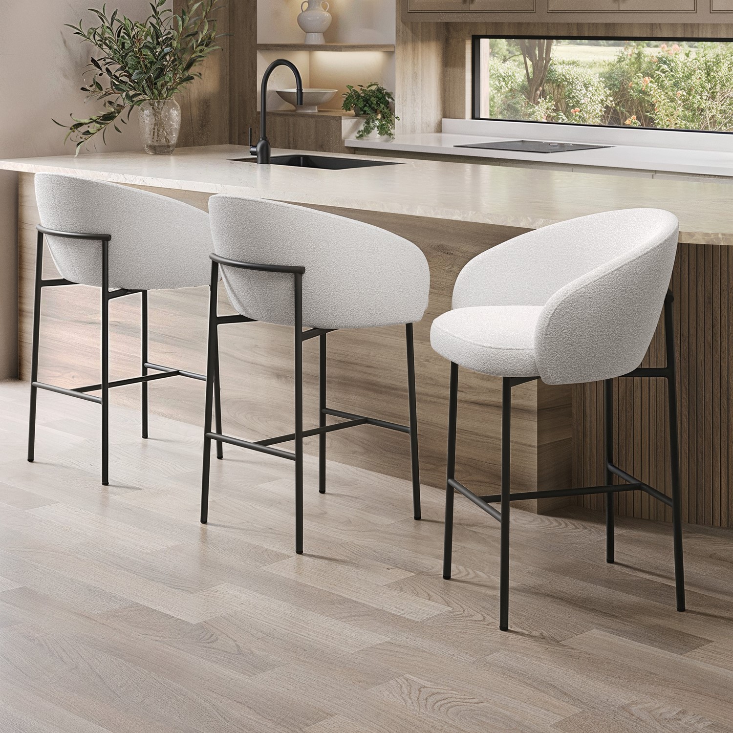These Cora kitchen stools are perfect addition to any kitchen area. The white boucle fabric matches any neutral interior, and the matt black legs and unique frame contrast beautifully. Design features exposed back detailing, adding a touch of modern elegance to your kitchen space. On trend low curved back shaping for ultimate comfort.