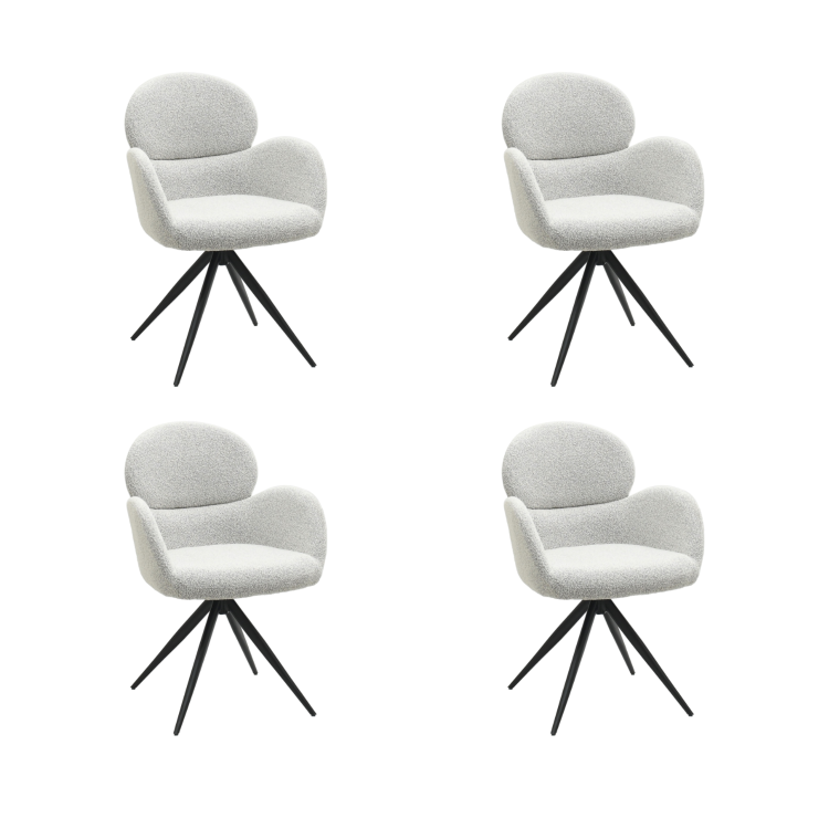 Introduce a retro flair to your home with these Neutral Boucle Swivel Dining Chairs. Upholstered in neutral boucle fabric, these chairs offer both comfort and style. The cocoon-like curved backrest provides a cosy seating experience, while the 360-degree swivel feature ensures versatility for dining, working, or relaxing. Supported by smooth black-finished legs, these chairs combine practicality with timeless design. Ideal as a set of four, they make a stunning addition to any dining table, kitchen, or even as statement pieces in your living space.