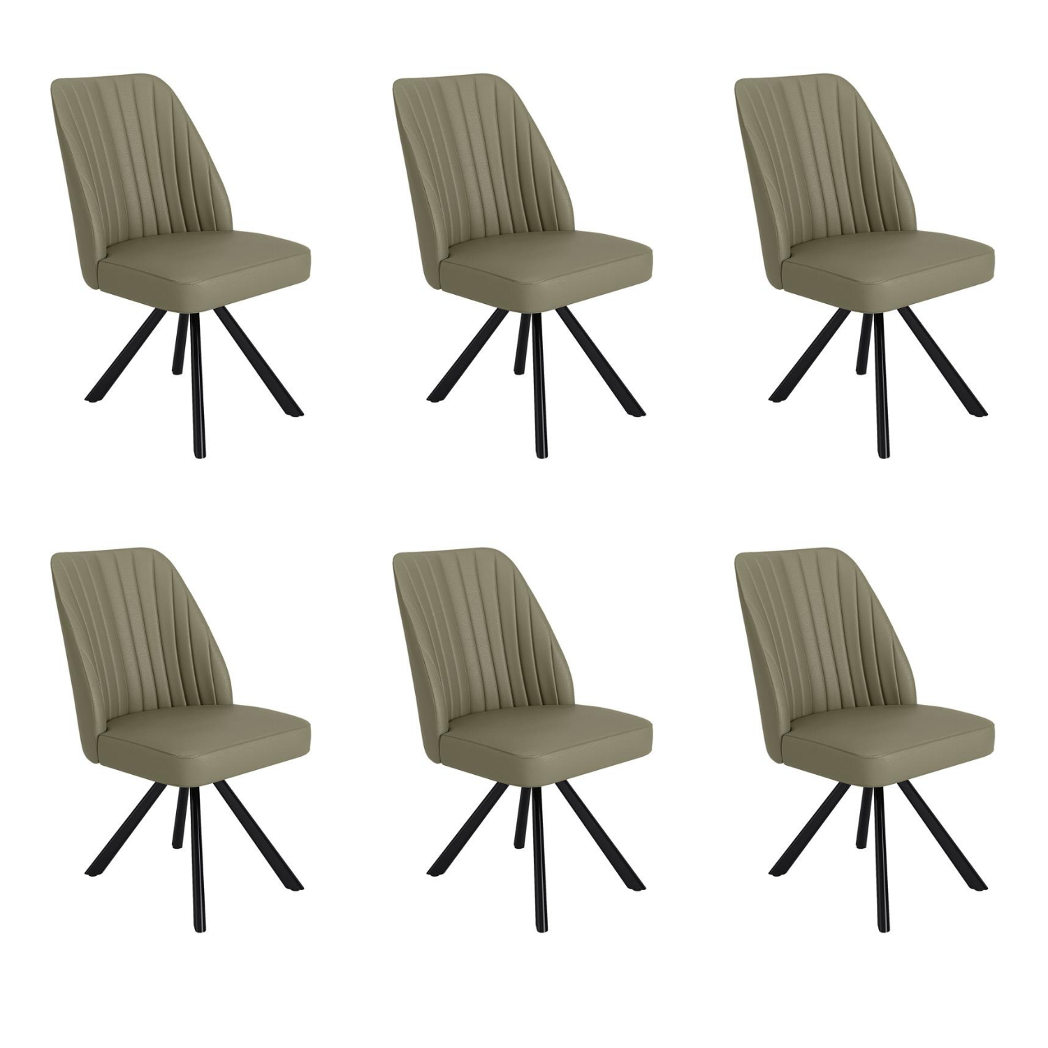 Refresh your dining space with the Logan swivel chairs – a stylish and practical addition to any modern kitchen or dining area. This set of six chairs is upholstered in sage green faux leather, offering an easy-clean surface with a soft, matte texture. The 360° swivel base allows easy movement, and thanks to the auto-return mechanism, the chairs reset neatly after use. Vertical stitched detailing brings a tailored look, while the black metal cross-base delivers a modern edge and reliable support. Whether used around a dining table or as accent chairs, Logan brings effortless charm and functionality to the room.