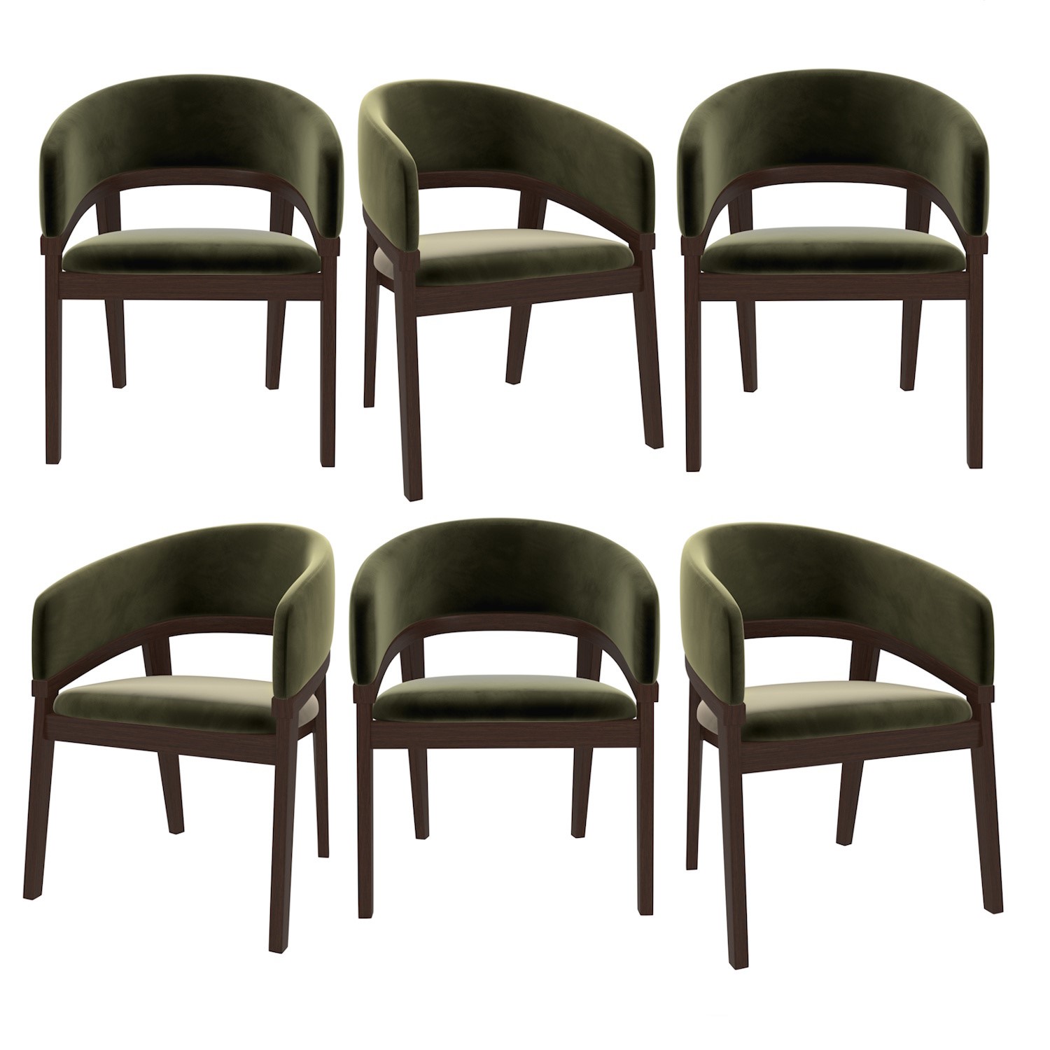 Upgrade your dining space with these curved dining chairs. Featuring an elegant cut-out and curved backrest design, these chairs blend modern sophistication with everyday comfort. The plush olive green velvet upholstery and padded back and armrests are perfect for long dinners or casual gatherings. Built for durability, the solid wood frame with a walnut-stained finish adds warmth and stability, making these chairs a long-lasting addition to your home.
