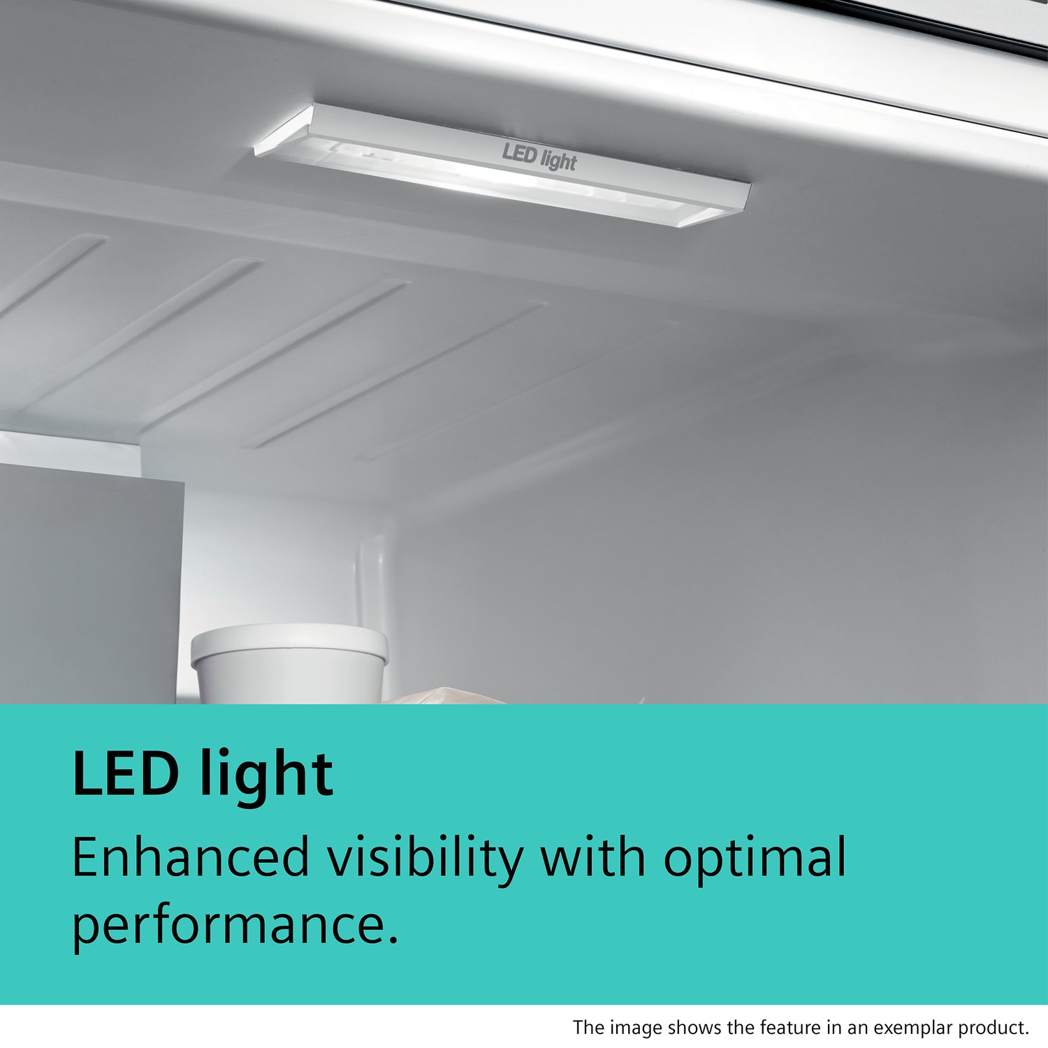 Now you can see all the items in your fridge in the best light. The built-in, energy-saving LED light provides even lighting throughout the fridge to keep all items in view, so you can see everything you have at a glance.As the LEDs are located at the front, they cannot be obstructed by items at the front. If your appliance features Home Connect, you can also switch the LED light on and off, or adjust its brightness, via your Home Connect app.