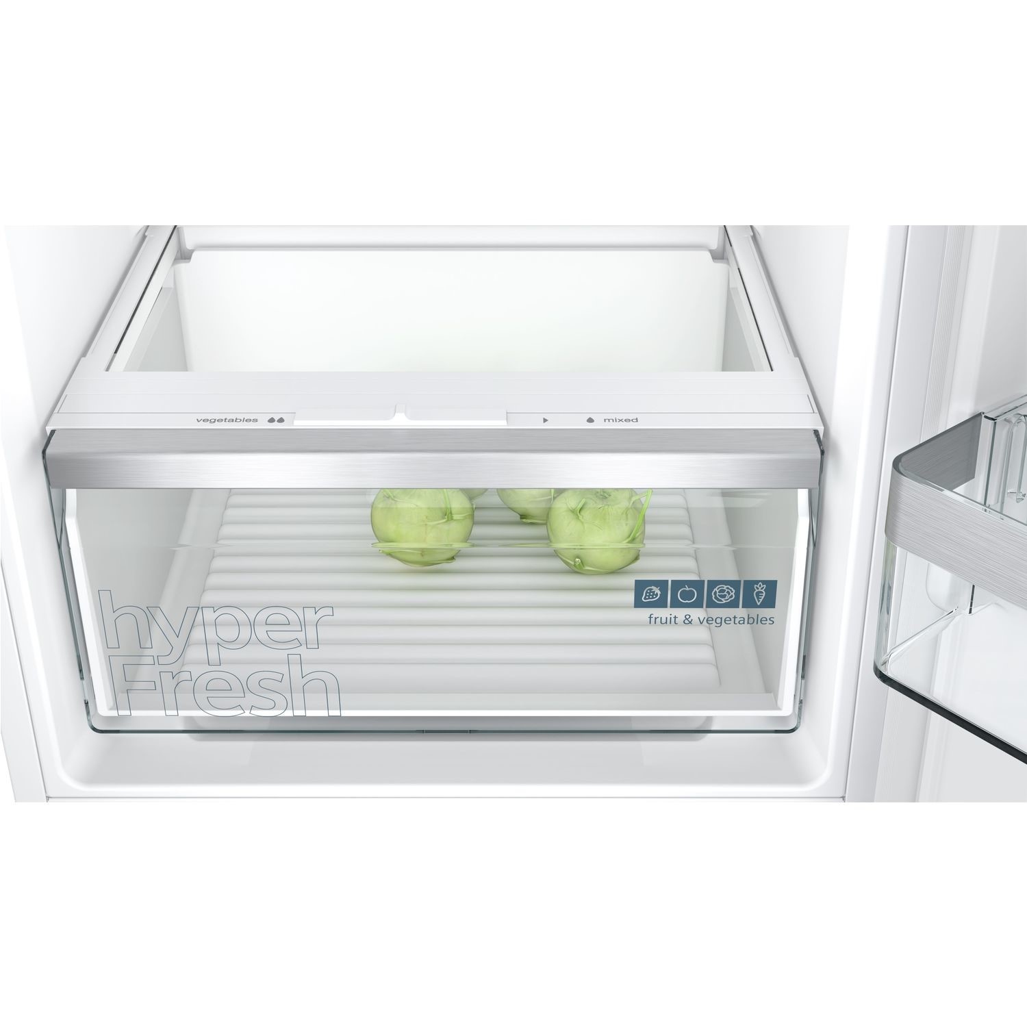 - Fruit and vegetables stay fresh for longer in the hyperFresh drawer thanks to the humidity slider