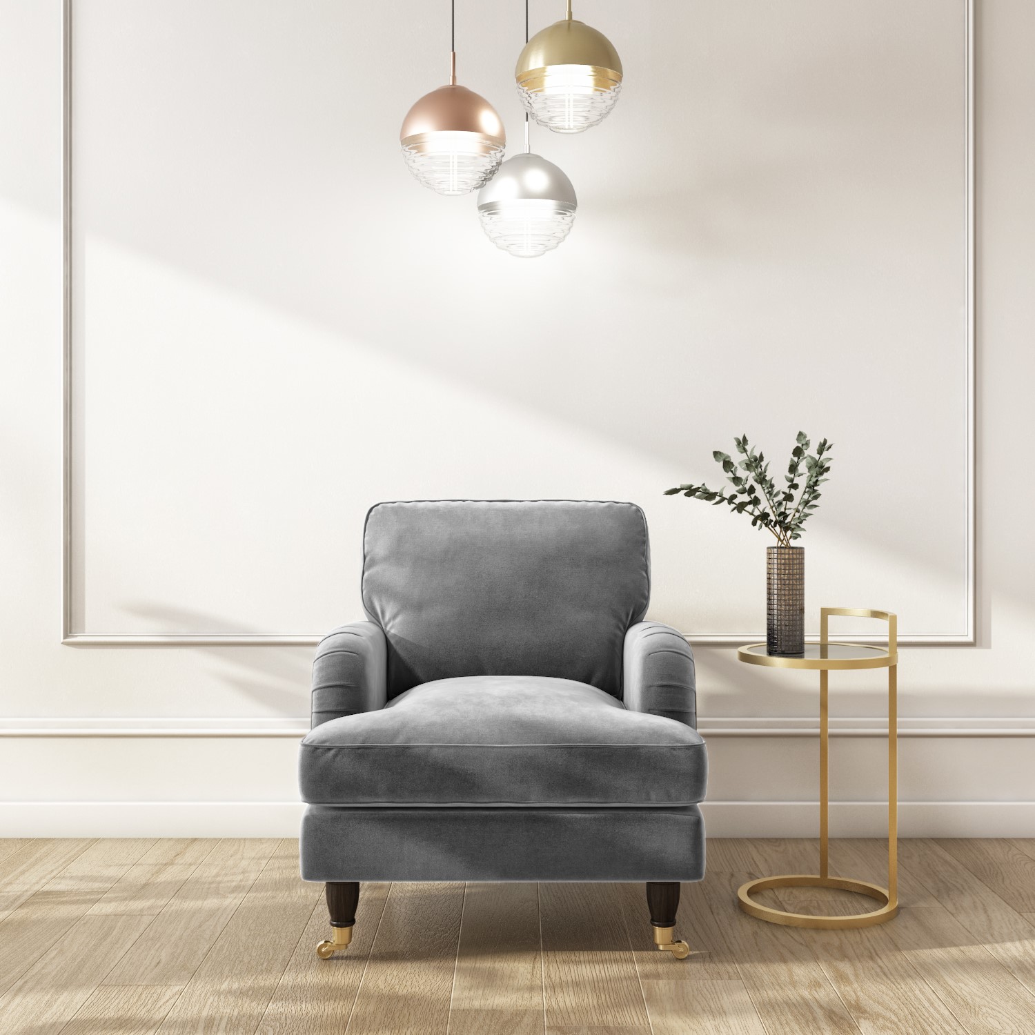 Complete your modern living room with the silver-grey Payton armchair. This stylish and versatile piece is the perfect addition to any home. Upholstered in soft to touch velvet and finished with dark legs and gold castors, you will never get tired of this classic piece.